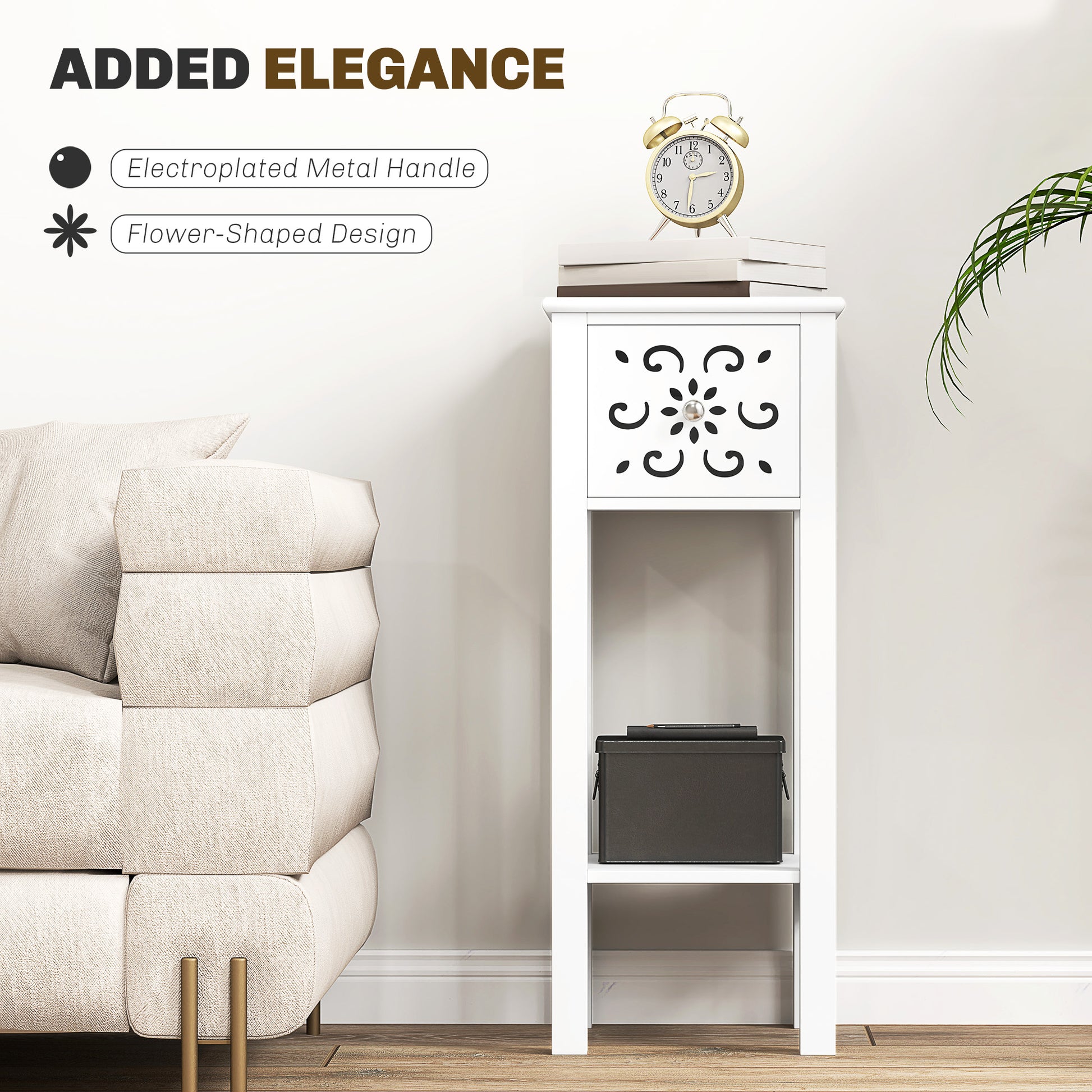 Bring the beauty of floral into the everyday, with these two HOMCOM side tables. In white, with a floral shaped cut-out on the top, both small side tables are elegant. They features a drawer, bottom shelf and flat top to hold plenty close to you. Complete with anti-tipping straps to safely fix to a wall.