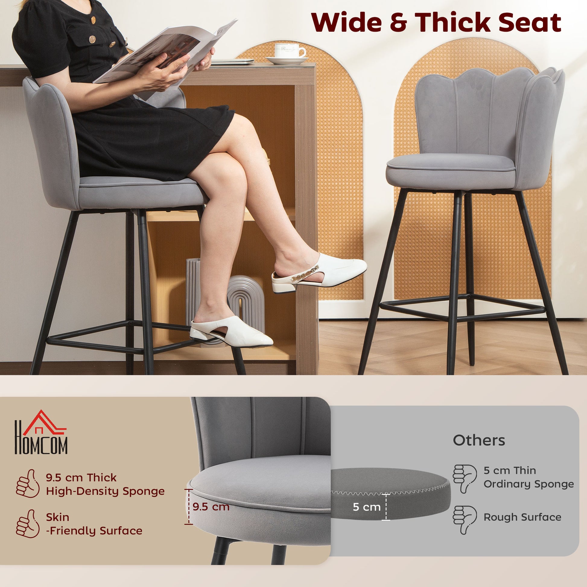 HOMCOM Set of Two Velvet-Feel Lotus Bar Stools - Grey
