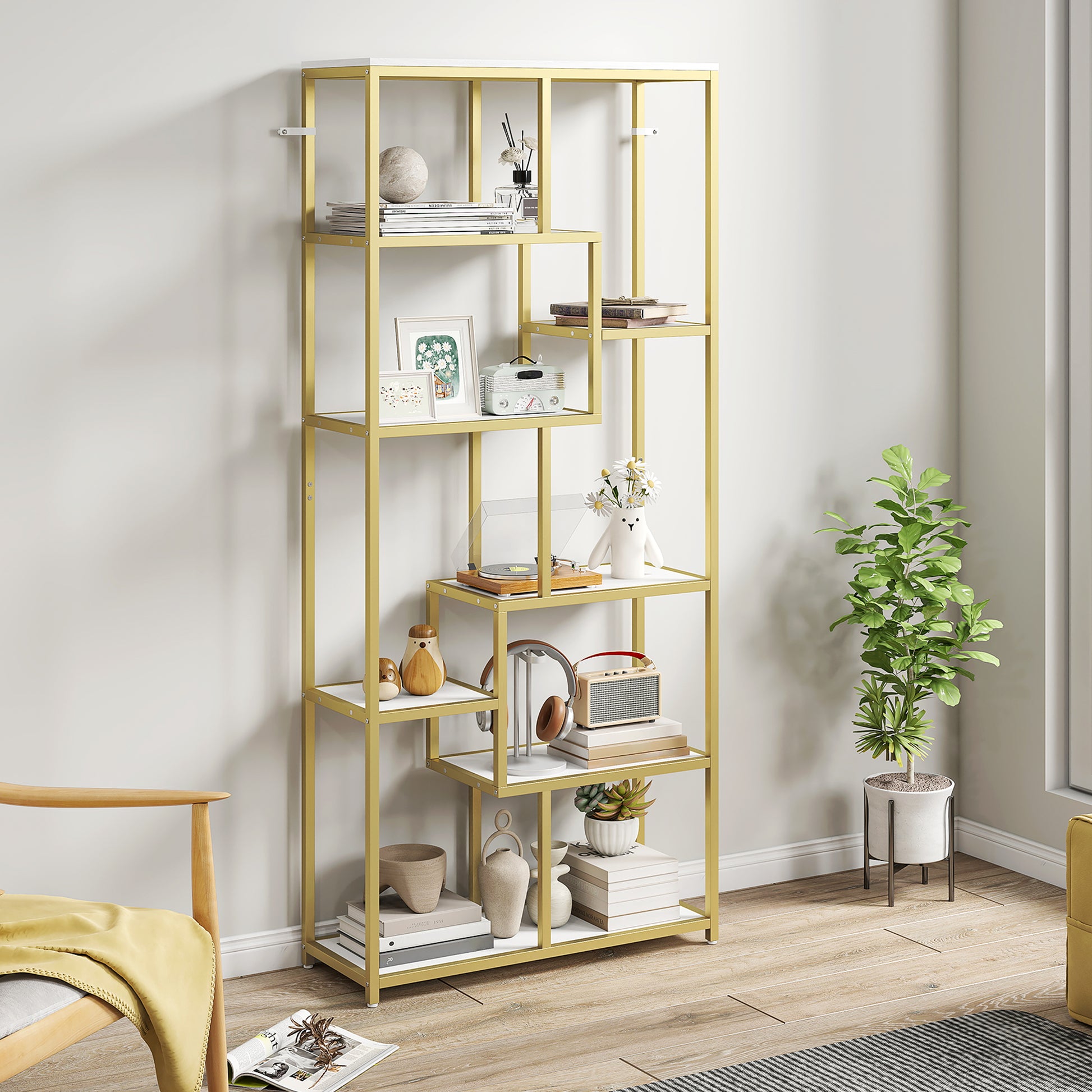 HOMCOM Seven-Tier Geometric Bookcase - White/Gold Tone