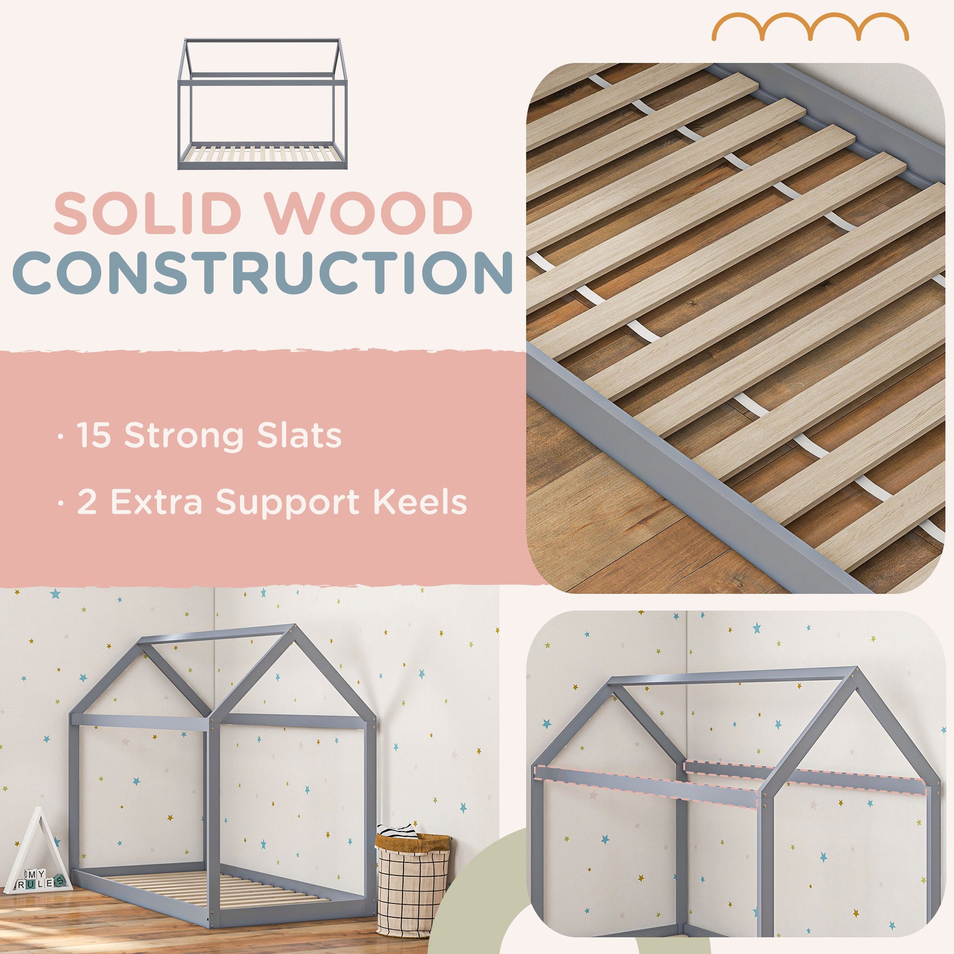 HOMCOM Single Bed Frame, House Scandinavian Style Wooden Bed Frame for 90W x 190Dcm Mattress, Pine Wood Bed Base, Grey
