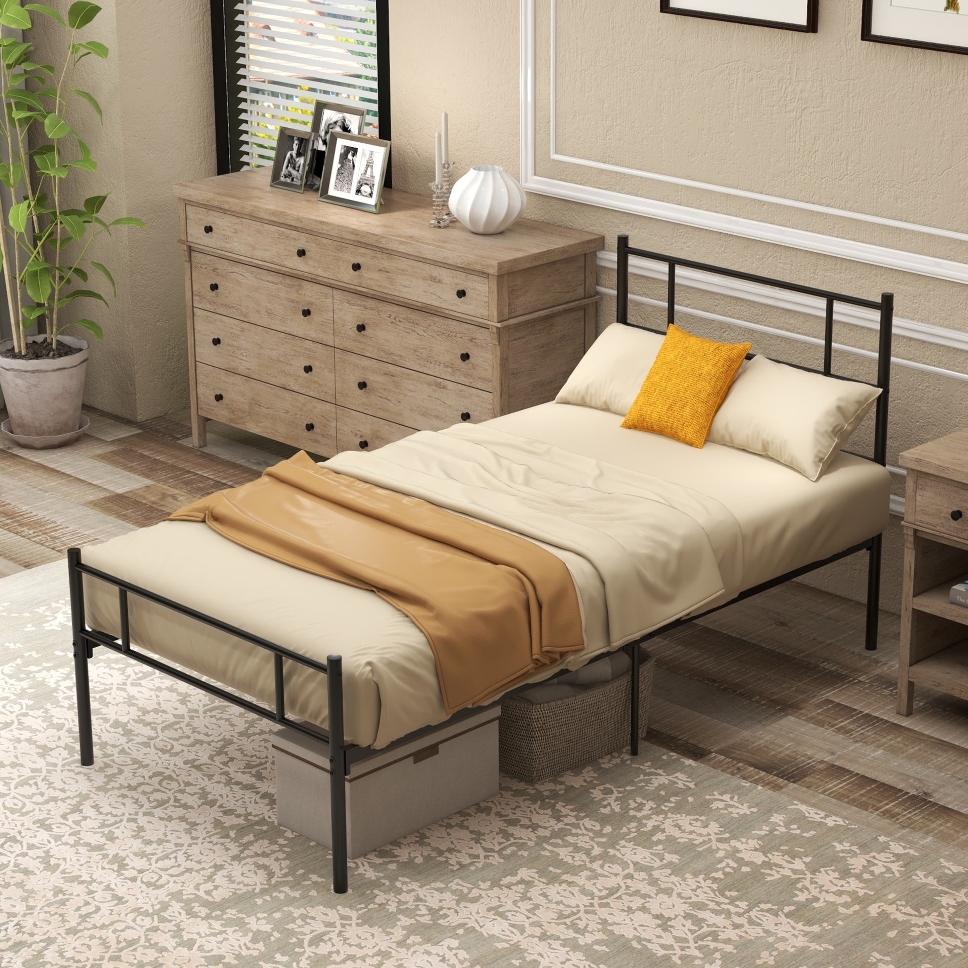 Make dream times minimal with this bed frame from HOMCOM. The slim-cut frame, in a matte black finish makes it suitable for practically any bedroom space - whatever your interior decor. Made from metal with sturdy legs, this frame will keep you supported so you can rest and relax in peace - with the built-in slats and tall headboard holding your mattress in place at all times. Comes with spacious under-bed clearance, giving you handy, out-of-sight storage space.