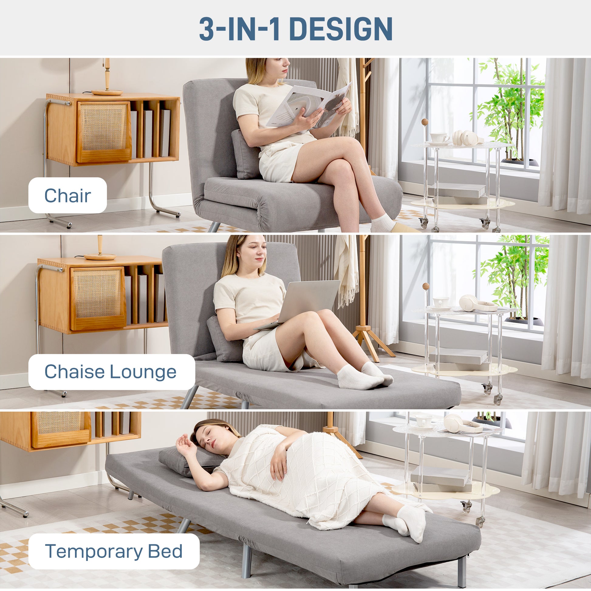 From sitting to sleeping, do it in style with this HOMCOM chair bed. Thanks to the click-clack mechanism, it's easy to switch from the armless chair to a chaise lounge or a single bed - perfect for using from day through to night, and giving last minute guests a comfortable spot to rest overnight. You can also adjust the back between five different angles: lie back at the position you want. Filled with high-density foam for comfort, and complete with a long pillow for support.