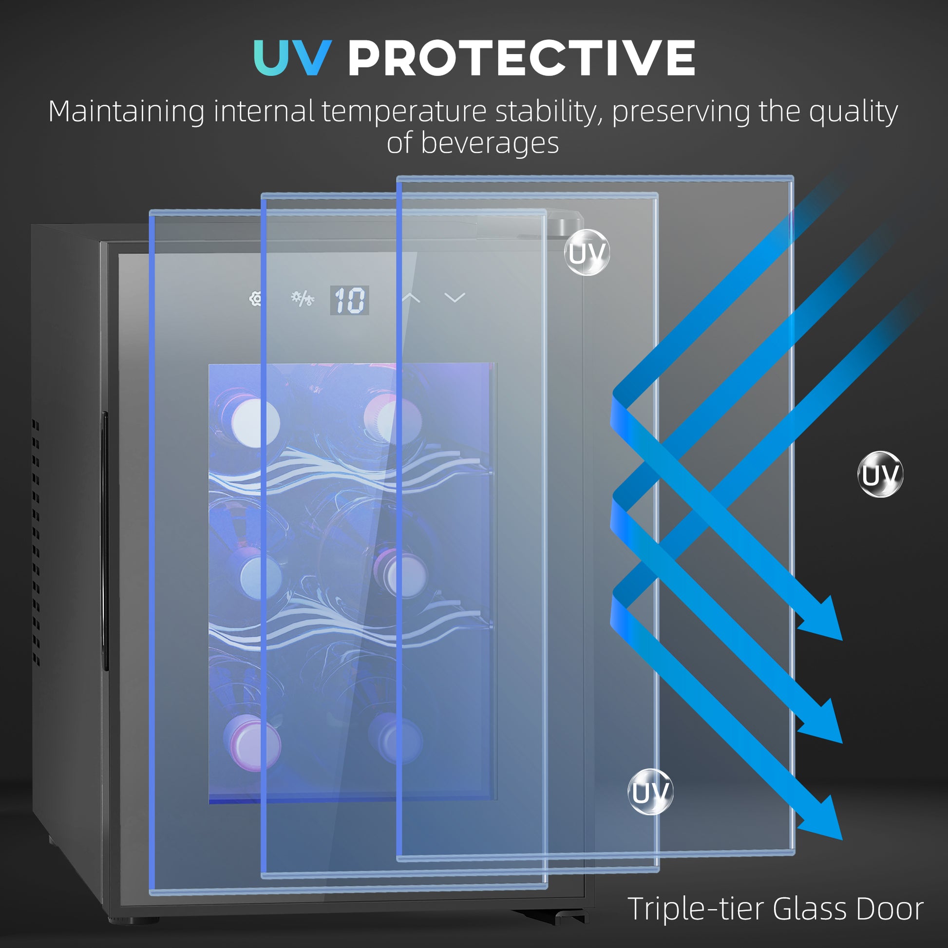 Chill your cherished bottles to perfection in this HOMCOM wine fridge. Two full-length chrome racks hold six bottles; also adjustable to fit larger bottles when needed. Adjust the temperature between 8-18℃ to find the coolness best for you. Complete with a triple glass door, which is also resistant to damaging UV rays.