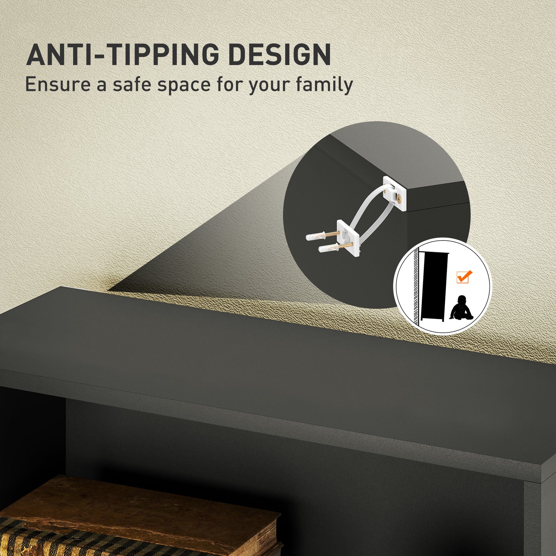 - Anti tipping straps to fix unit to a wall for safety