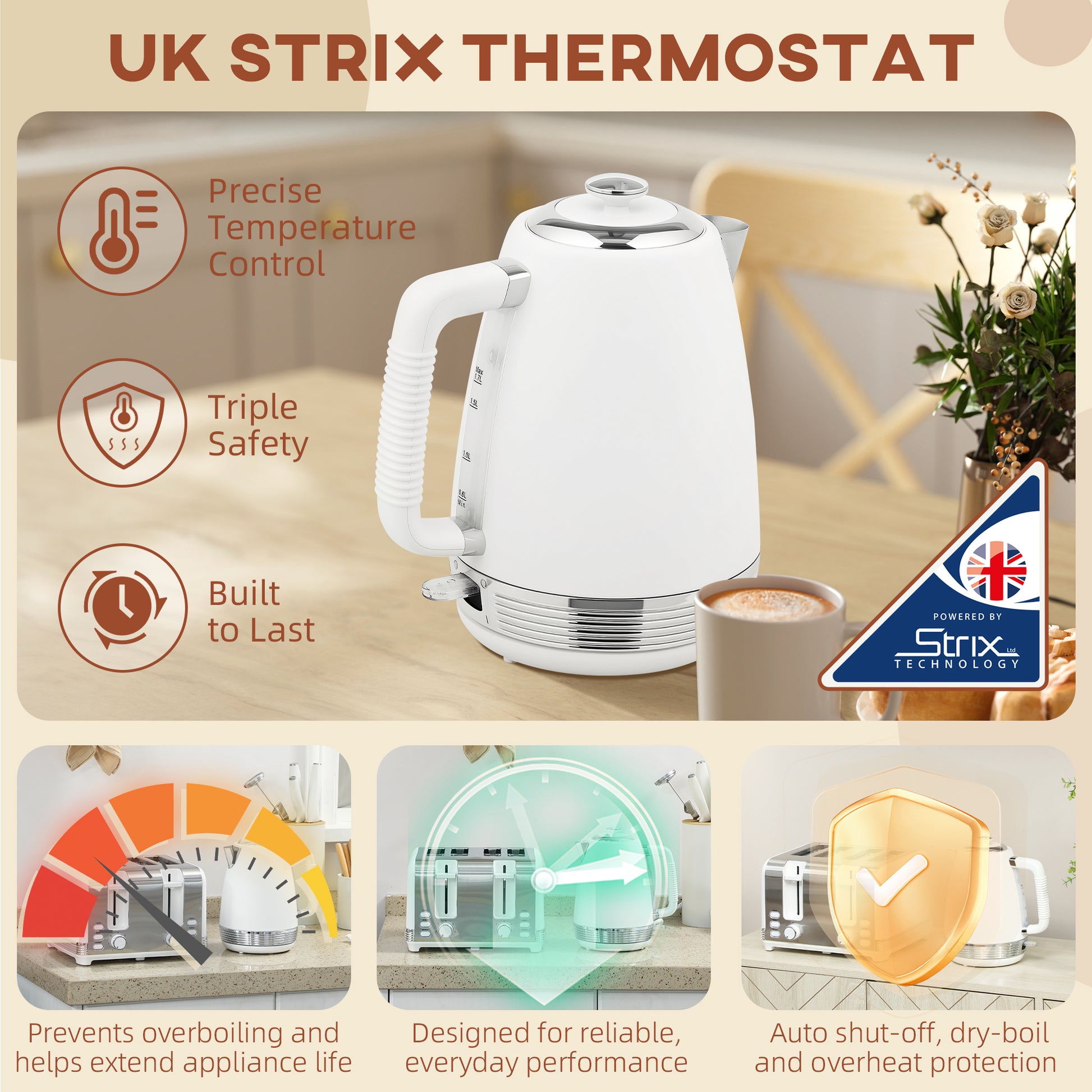 HOMCOM Stainless Steel Kettle and Toaster Set, 1.7L 3000W Rapid Boil Jug Kettle with UK Strix Thermostat, Limescale Filter, 4 Slice Toaster with 7 Browning Controls, Crumb Tray, White and Silver Tone