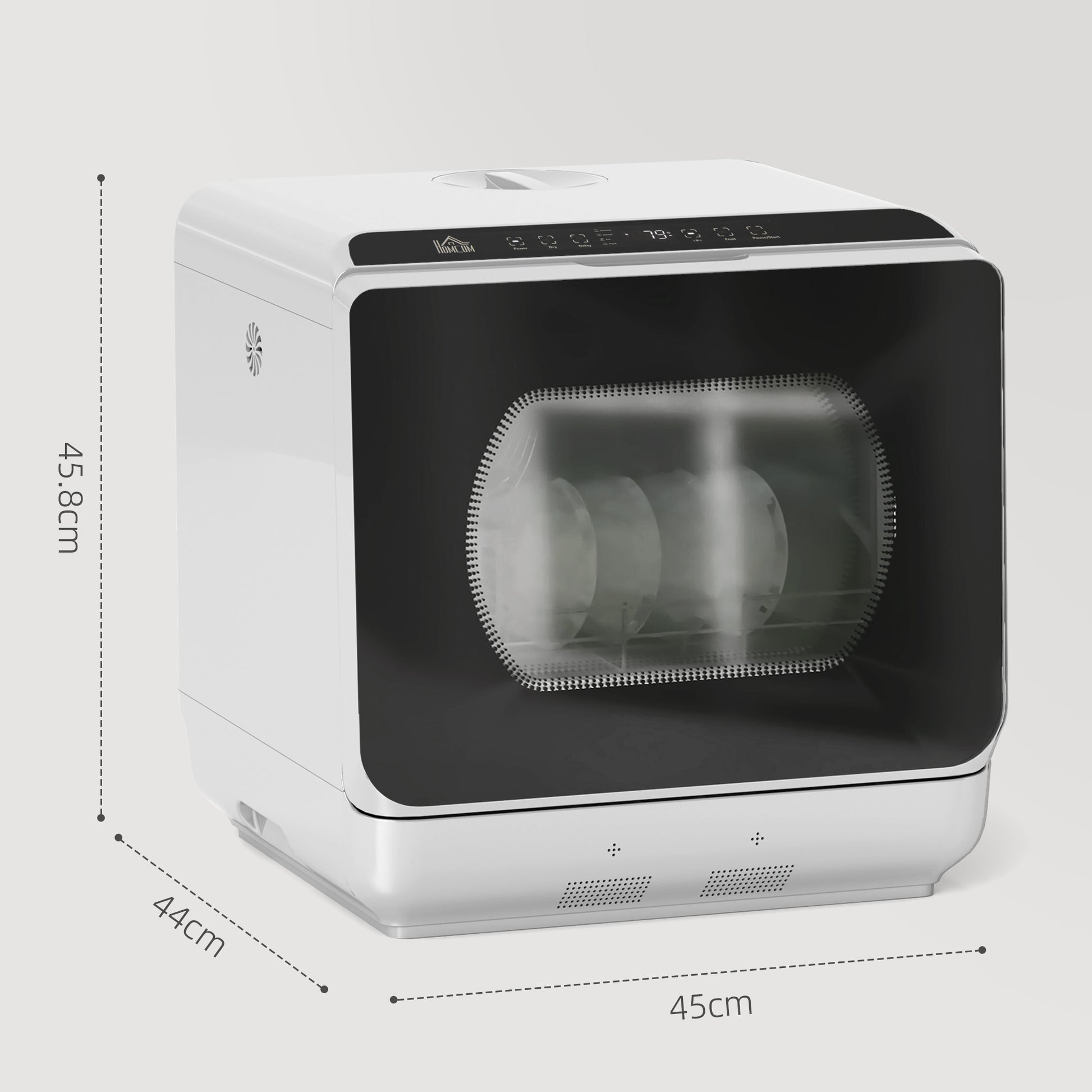 Say goodbye to the hassle of manual dishwashing, anywhere, with this HOMCOM tabletop dishwasher! It features six programs: intensive, efficient, normal, rapid, fruit wash and drying. The efficient spray arm ensures sparkling clean dishes every time. A compact dishwasher, suitable for four-person households.