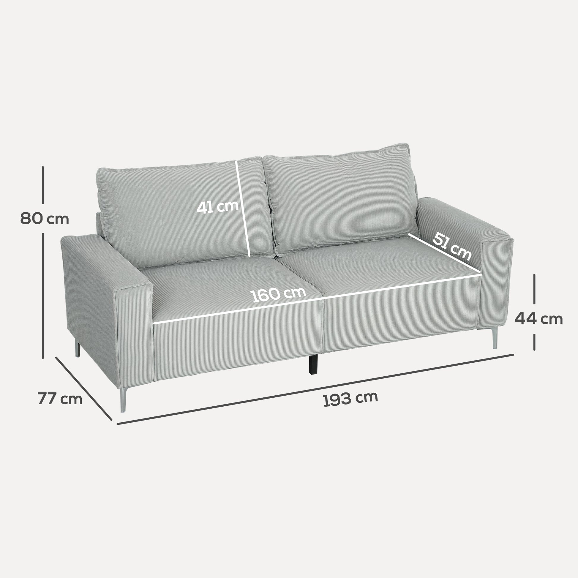 An on-trend modern addition for your home, with this HOMCOM three-seater sofa. Filled with comfortable high-density foam and shape-retaining S-springs, it's wrapped in cool corduroy upholstery. Two back pillows included for extra comfort as you relax into this cosy settee, complete with steel legs for strong support.