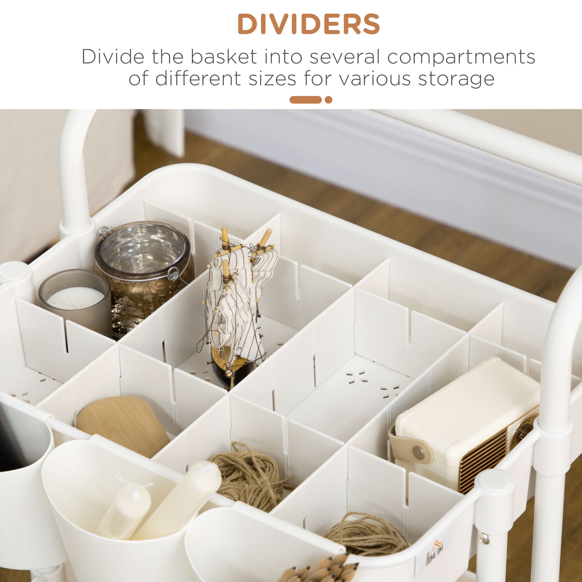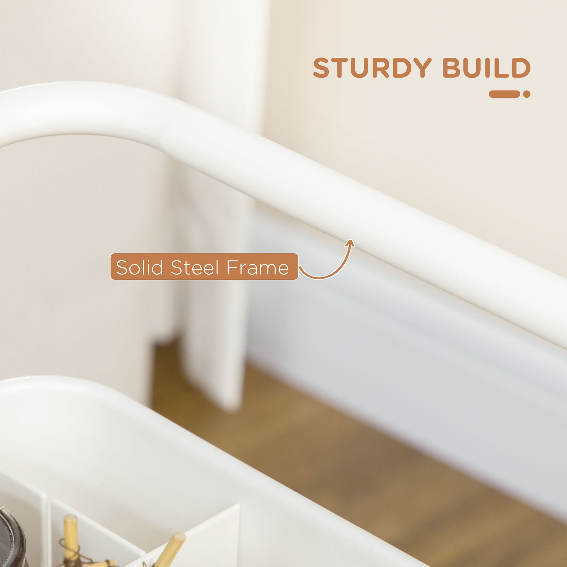 This HOMCOM rolling cart offers on-the-go storage, for whatever you want. Three-tier design, with three hanging boxes and four hooks give you plenty of holding room. A steel frame for a reliably strong structure, fitted with four wheels and a handle to move around easily; two wheels can be locked in place. Top tray is sectioned into 12 parts for better organisation. A kitchen storage trolley, drinks trolley - or how about keeping all beauty essentials together? The choice is yours.