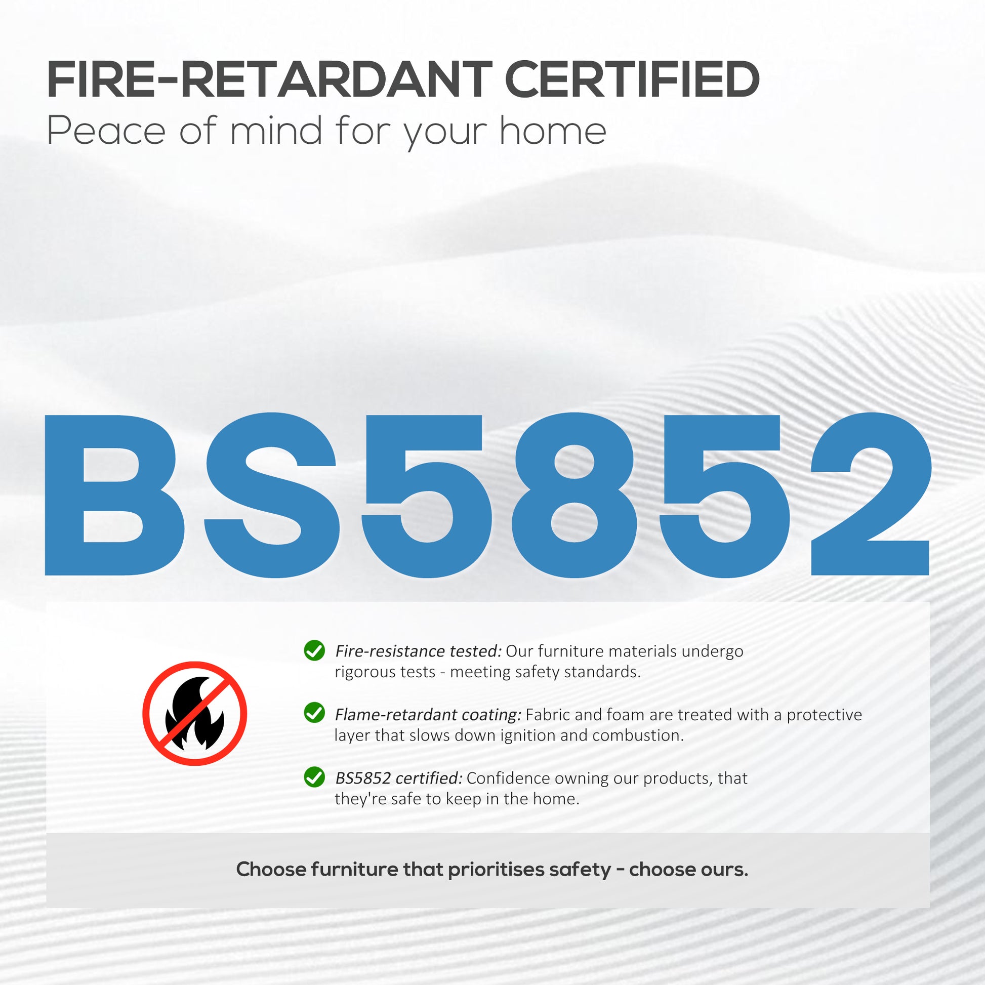 - Tough wood and metal frame, with fire-retardant materials for safety