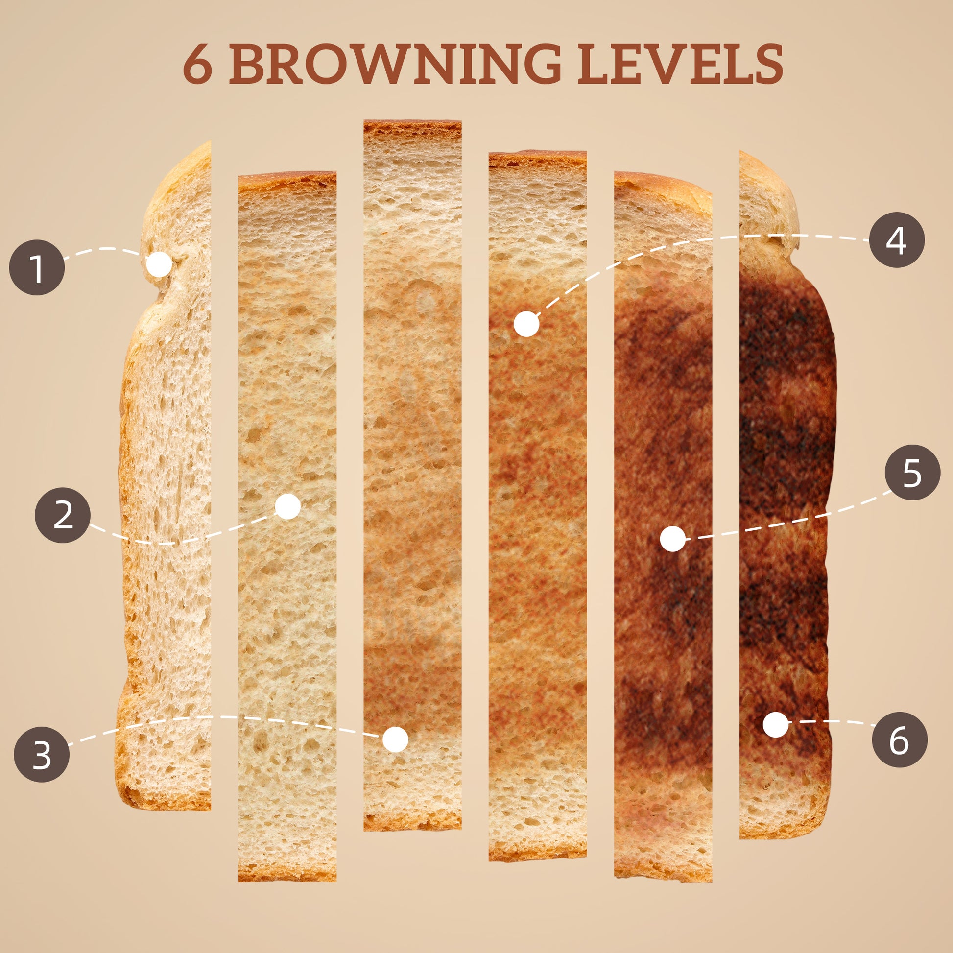 - Two-slice toaster has six browning levels, plus defrost/reheat/cancel