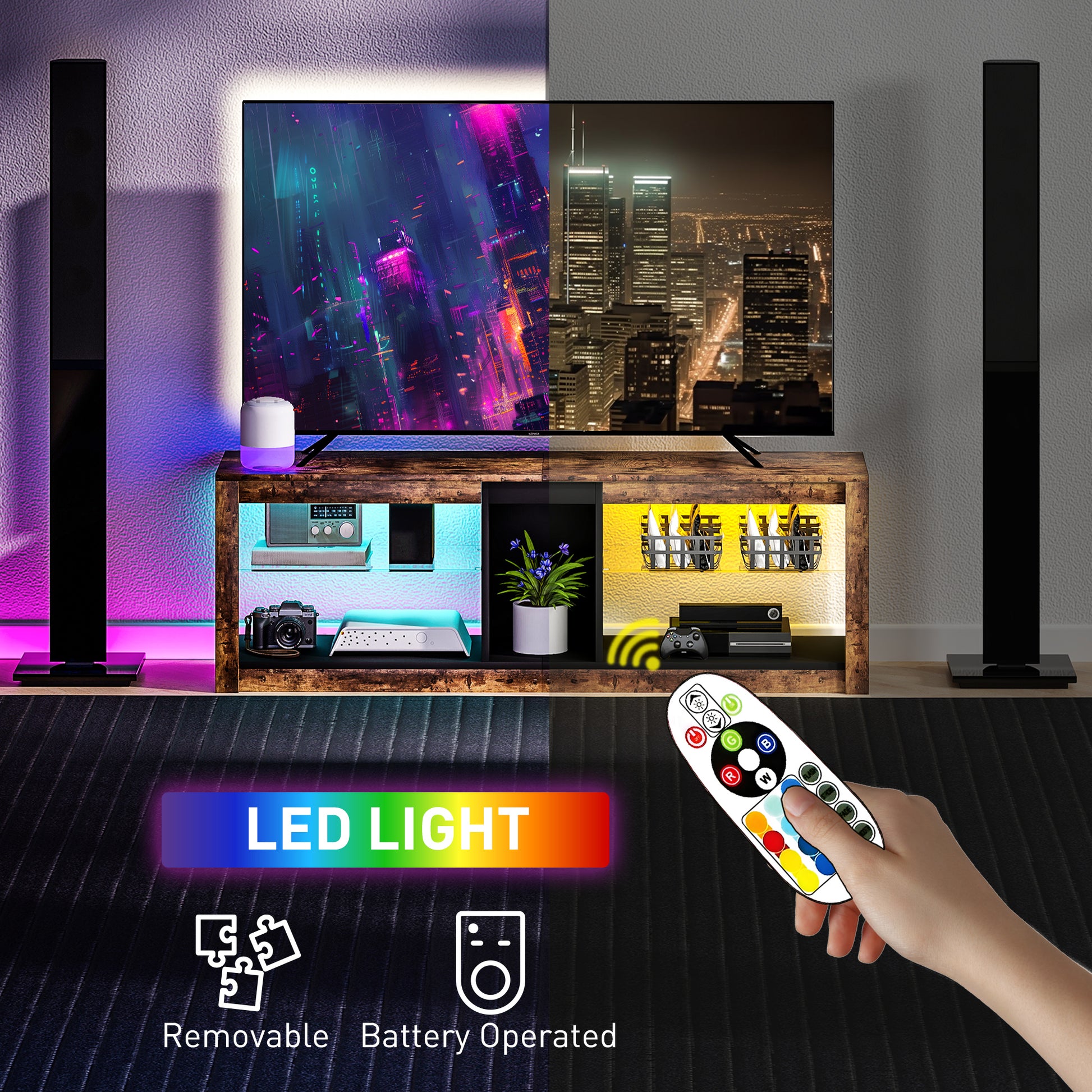 - Removable LED light strips feature seven colour options