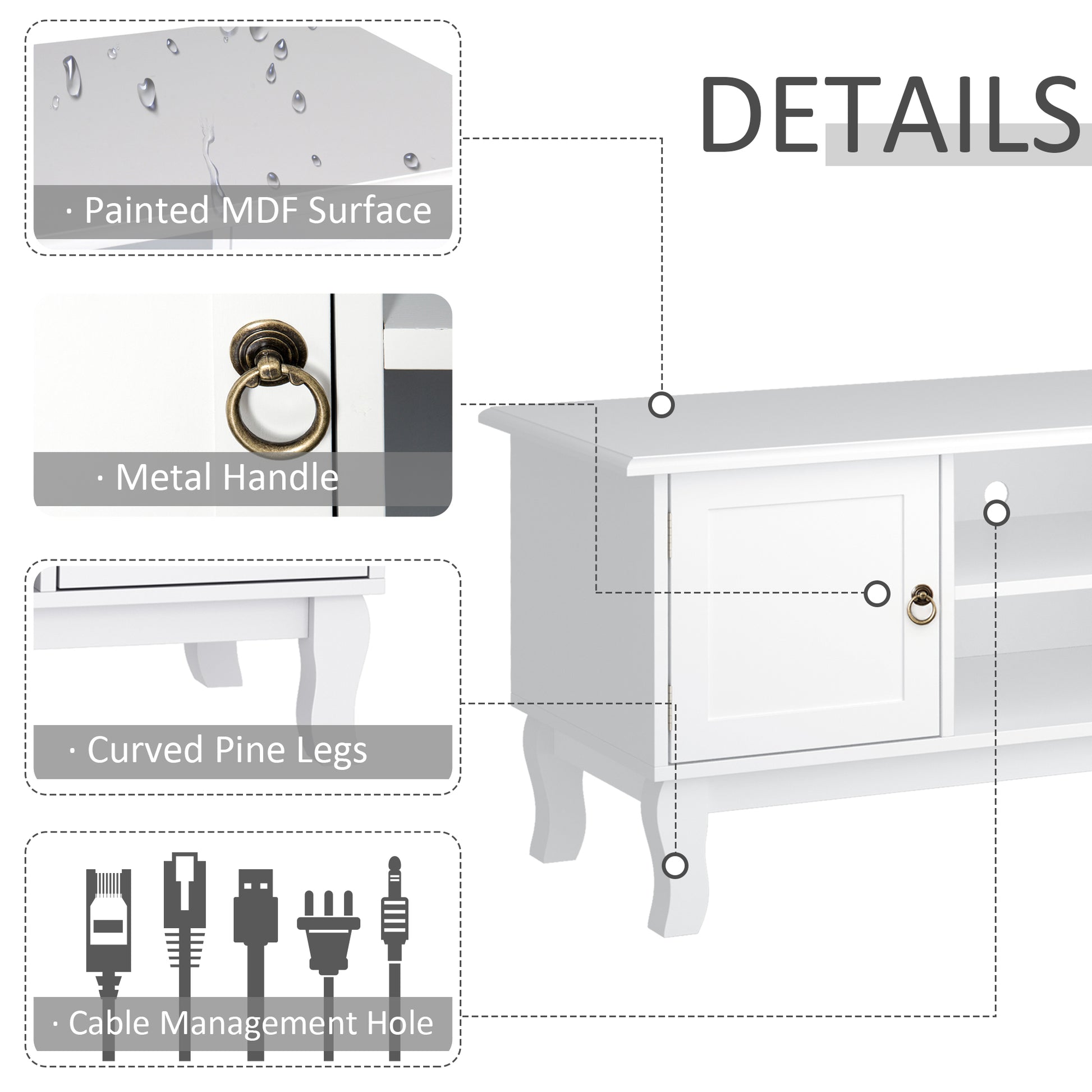 The stylish TV unit from HOMCOM features painted MDF and curved solid pine wooden legs, to create an inviting modern and classical atmosphere and also ensures reliable stability and durability. The smooth materials make it easy to clean with soft cloth. The spacious design with 2 cabinets and 2 open shelves provides lots of room for your DVDs, remotes, magazines and other small items. Add the spacious stylish media console to your home and office, creating an ideal entertainment center.