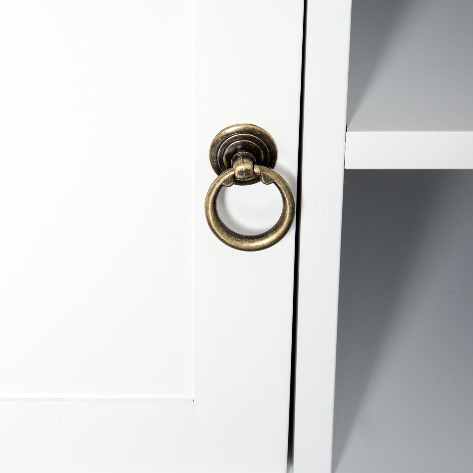 - The cabinet doors with circular metal handles and stoppers are easy to open and close