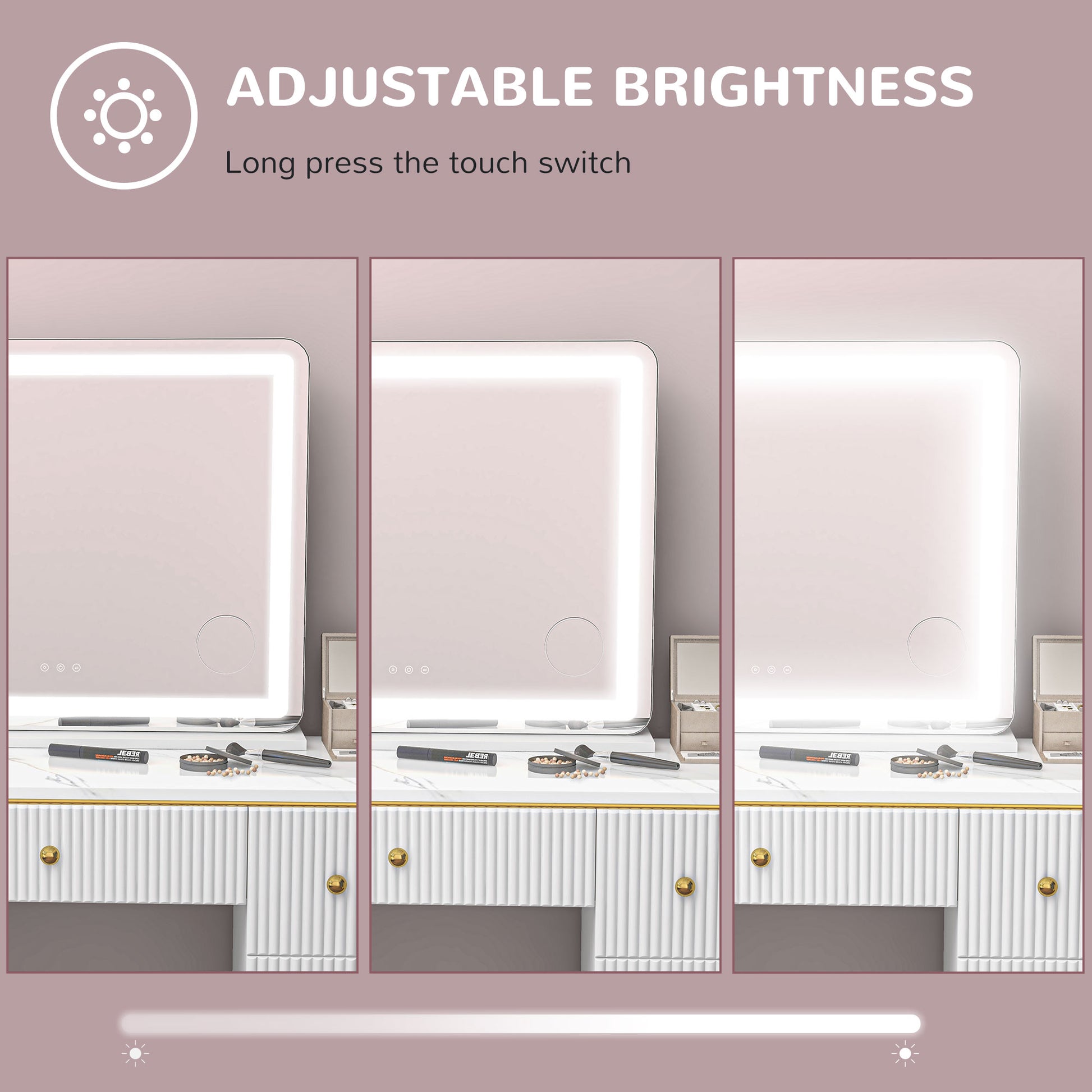 Discover a flawless reflection with the HOMCOM LED vanity mirror. Its expansive size ensures your entire face is visible, while the enduring 50,000-hour LED lifespan brightens your beauty routine. Charge your gadgets with the convenient USB port and switch between warm, cool, or natural light to improve your look, all with a simple touch.