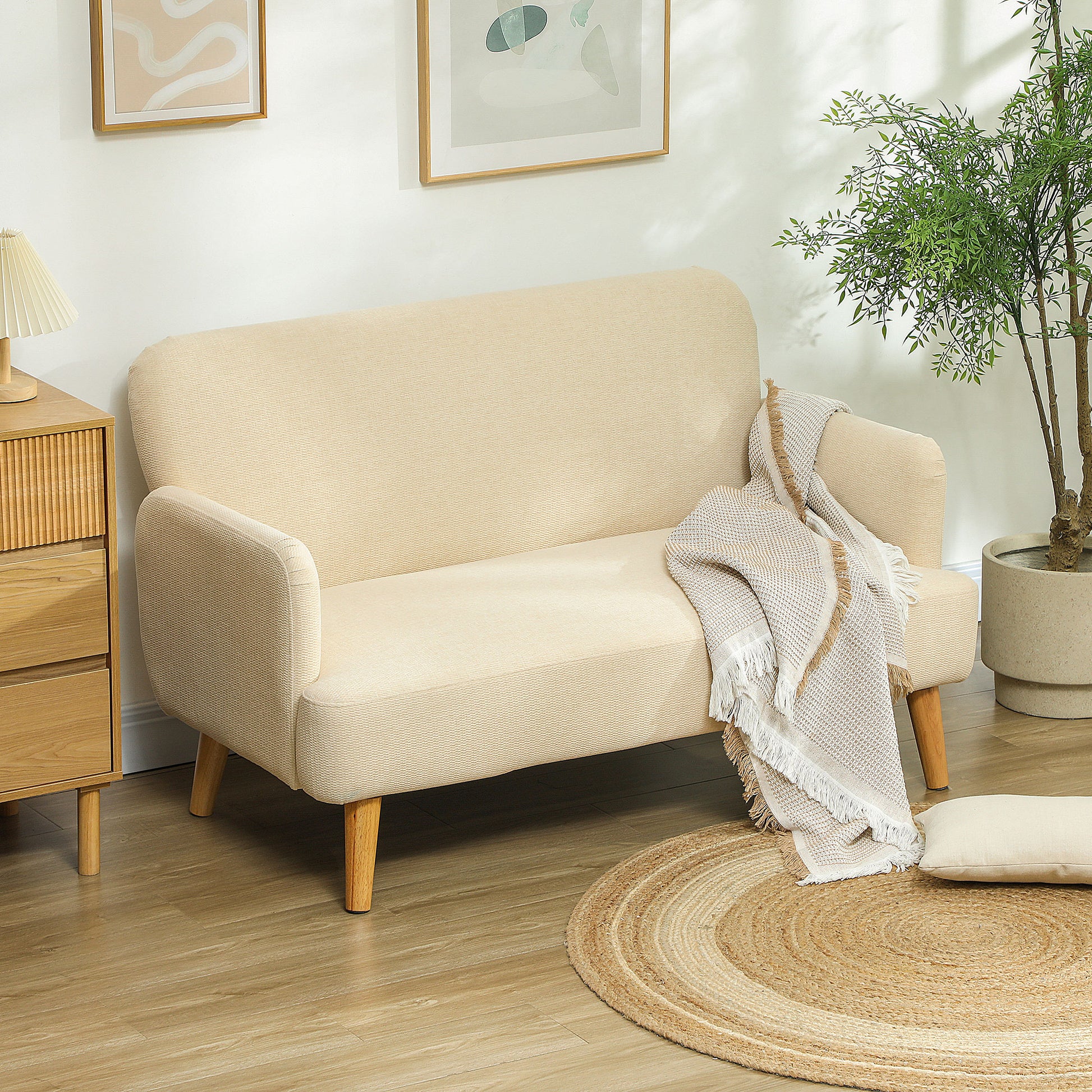 HOMCOM Velvet Feel Fabric 2 Seater Sofa, Small Sofa Loveseat with 21cm Thick Padding and Wood Legs, Cream White