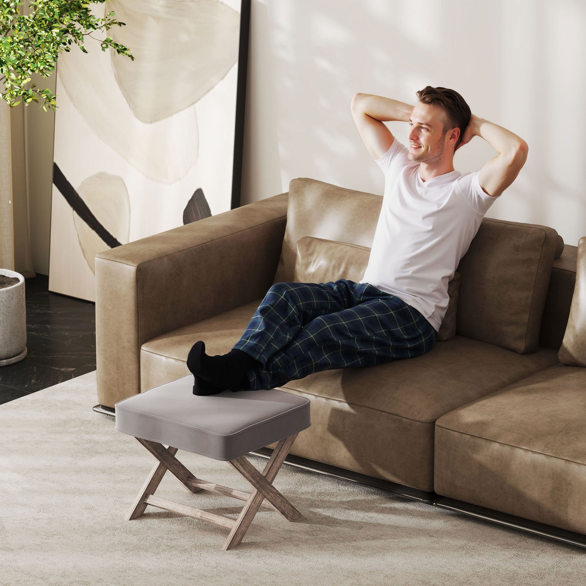 HOMCOM Vintage Footstool Padded Seat X Leg Chair Velvet Cover Shabby Chic Footrest Solid Rubber Wood Frame 49.5 x 45 x 41 cm Grey