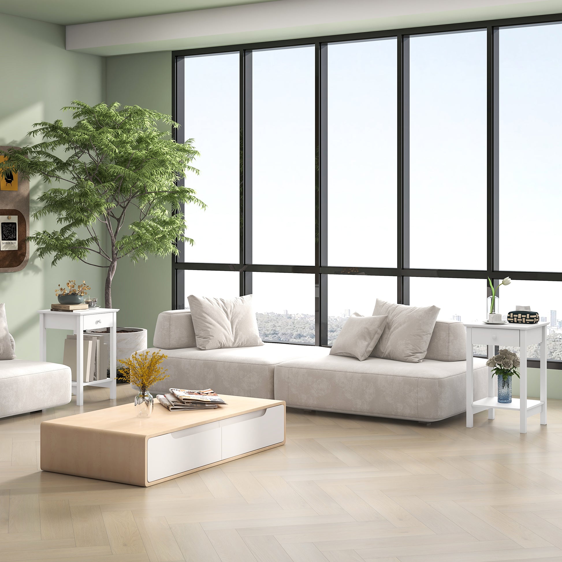 Bring elegance into your home décor with this sleek and stylish side table from HOMCOM. In a fresh white finish, it features a spacious drawer with handle and a bottom shelf, making it perfect for storage and organisation in your bedroom, kitchen, living room or hallway. Crafted into a spacious, yet compact design, it is ideal for smaller areas of the home and its smooth surface allows it to be cleaned easy. A smart and fresh piece of furniture for every home.