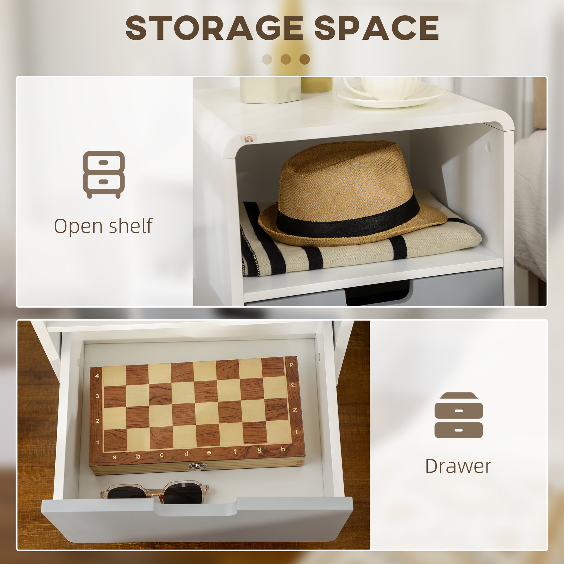 This classic Scandinavian styled living room table from HOMCOM is a perfect addition for your bedroom. Made from pine wood and MDF for long term use. Features a small open shelf and a grey lower drawer, providing sufficient space for your daily essentials. Easy to clean and maintain with painted surface.. This bedside table can be used as a sofa table, night stand, corner table etc. Bring style and functionality to your home with this wooden night stand!
