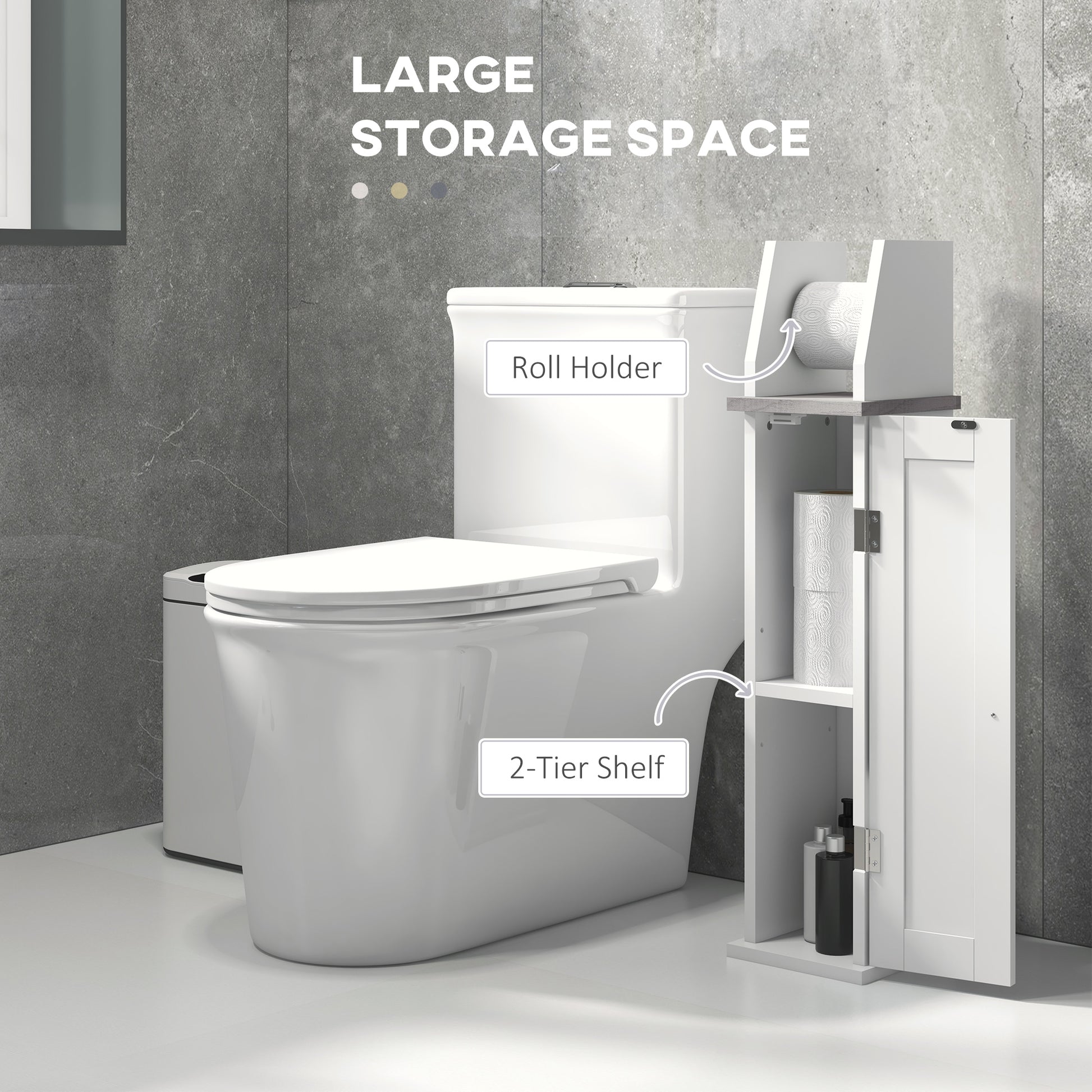 kleankin Slim Bathroom Floor Cabinet with Cupboard, Roll Holder and Adjustable Shelf, Toilet Roll Storage Unit for Toilet Paper, Shampoo, White