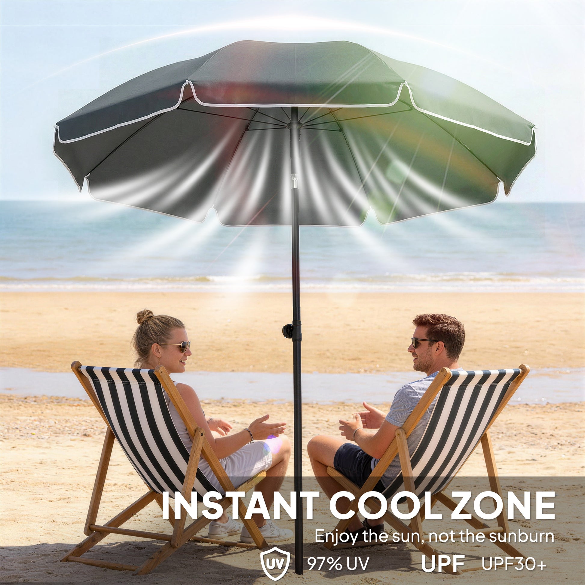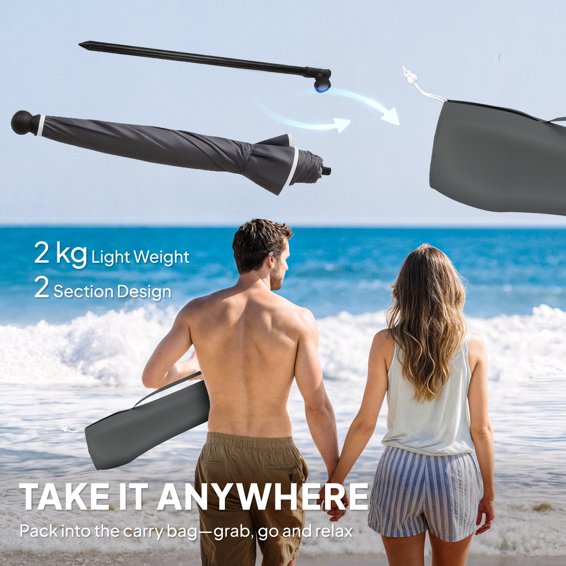 Enjoy relaxed seaside moments with the Outsunny beach umbrella, bringing comfortable shade from morning to afternoon. The tilting canopy and adjustable pole make it easy to follow the sun while you unwind on a beach chair or beside a small table. A UPF30+ polyester canopy helps create a cooler spot under the sun, while the pointed pole pushes easily into the sand for simple setup. Lightweight and easy to carry in the included bag, it's ready for spontaneous days by the sea.