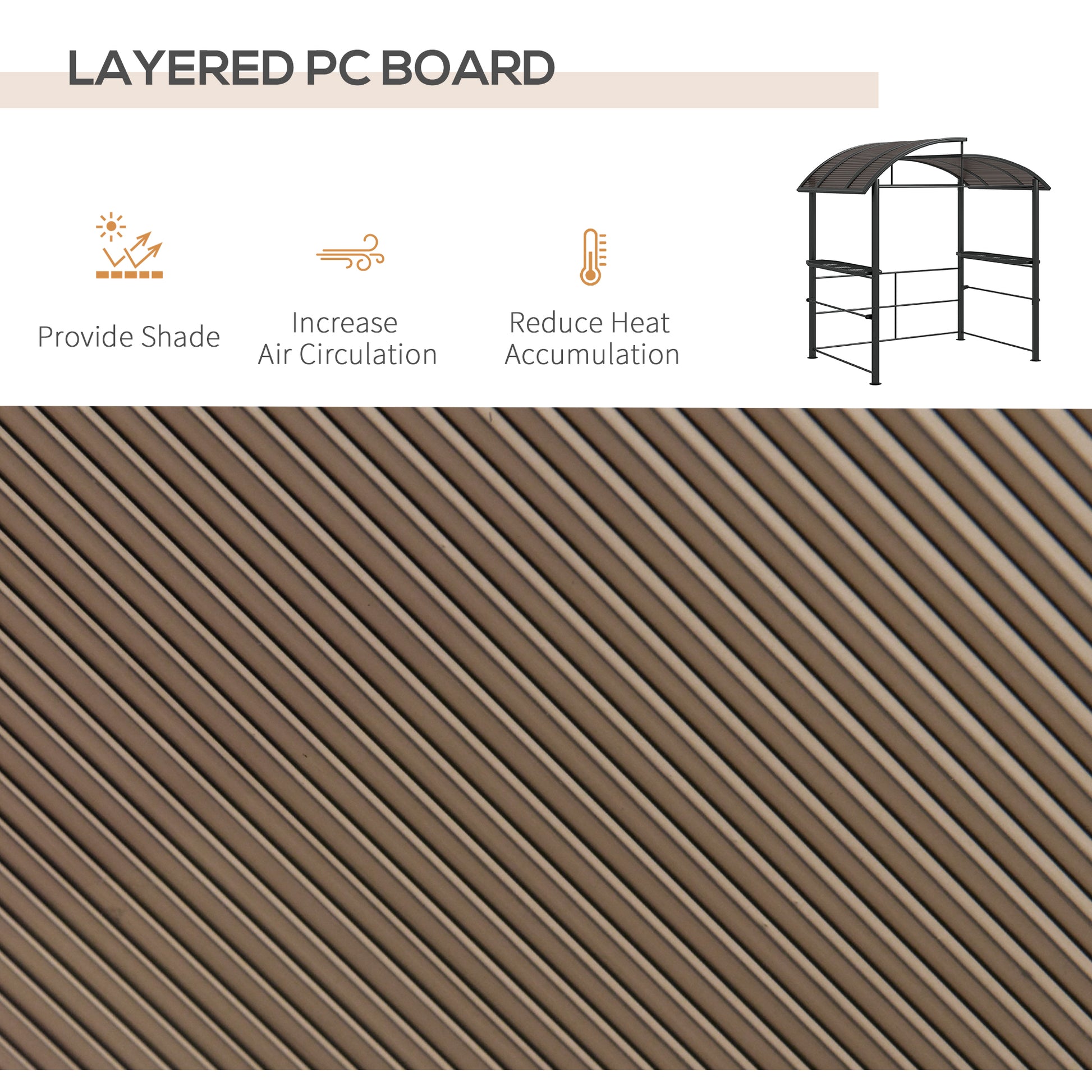 Don't you hate when you are barbequing with friends or family, but rain or strong sun threatens your fun day? Then make sure to check out this grill gazebo from Outsunny! The polycarbonate roof of the bbq gazebo is UV and rain resistant so you can BBQ any time you'd like. Furthermore, we made sure to include side shelves and hanging poles with the patio canopy, so storing plates and tools all in a place is easy. Have a great part and cook some delicious food in peace with our barbecue hut.