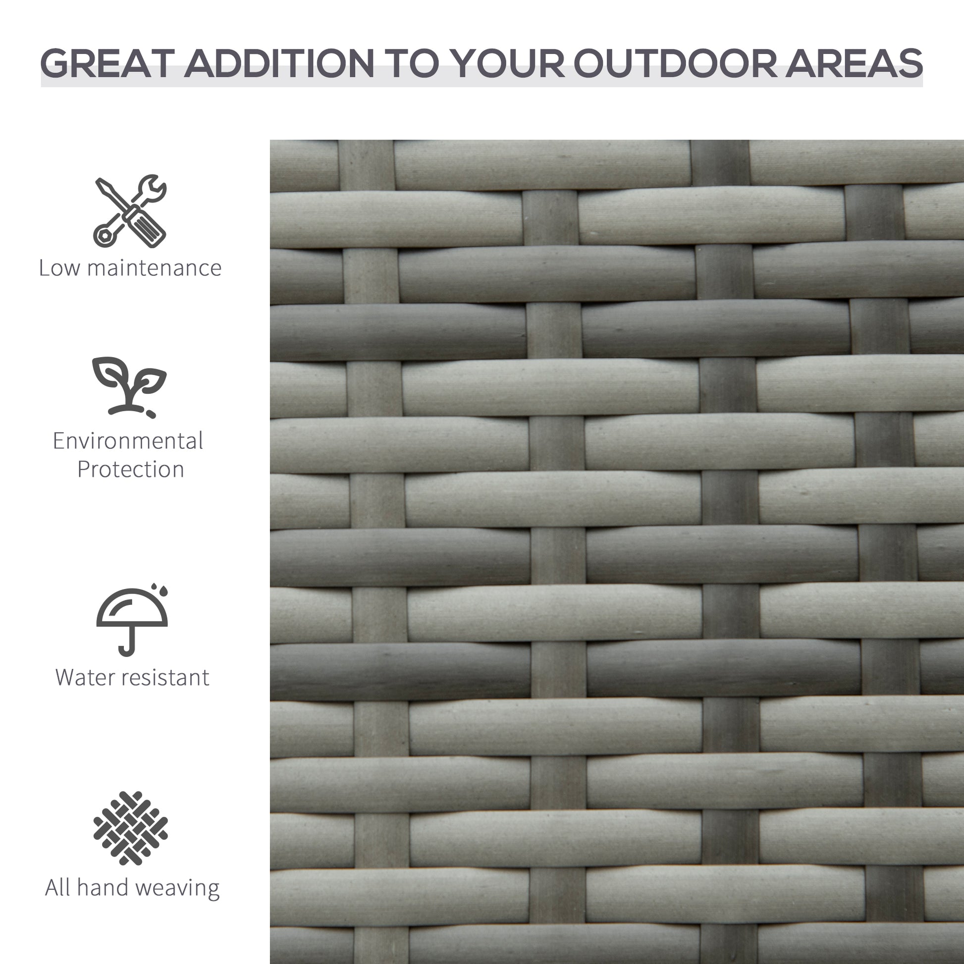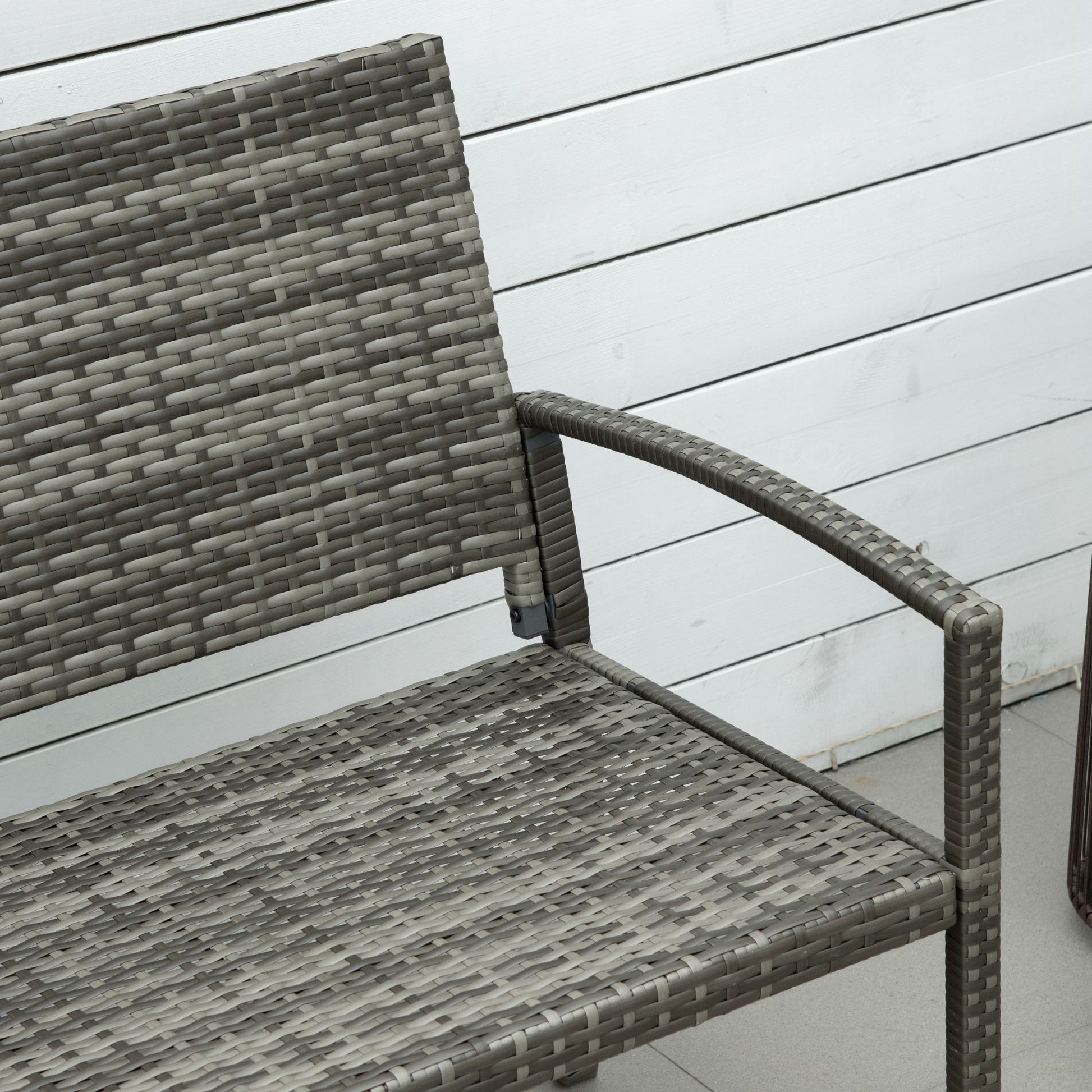 Bring a new stylish feel to your outdoors with this bench from Outsunny. It's formed of a two layer design: a metal frame for a strong structure, wrapped with PE wicker for extra protection and durability. The grey colour is stylish and blends in with other garden furniture easily. The two-seater design gives room to relax with a friend, finished with a high back and armrests for support. Minimal upkeep, with maximum comfort and delight.