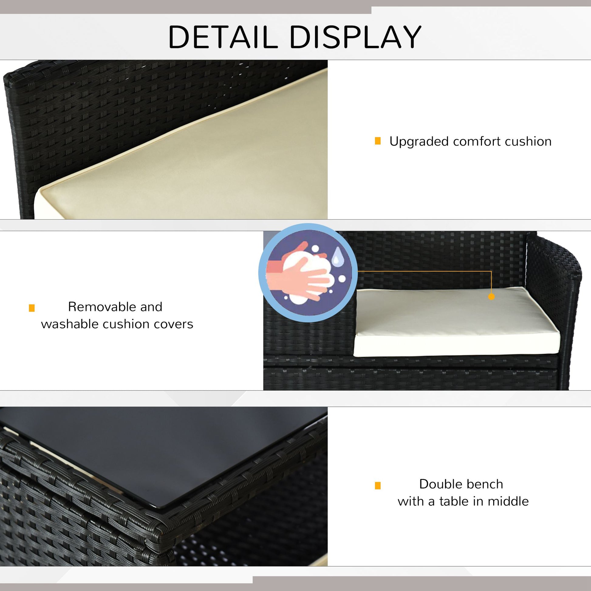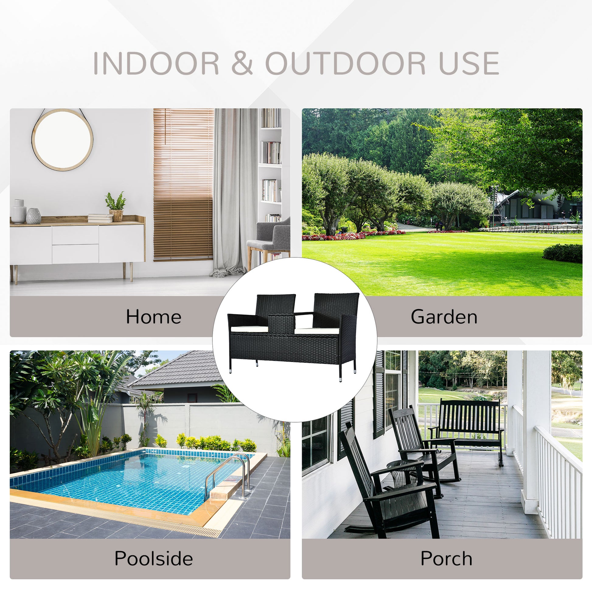 Outsunny 2 Seater Rattan Campanion Chair Wicker Loveseat Outdoor Patio Armchair with Drink Table Garden Furniture - Black