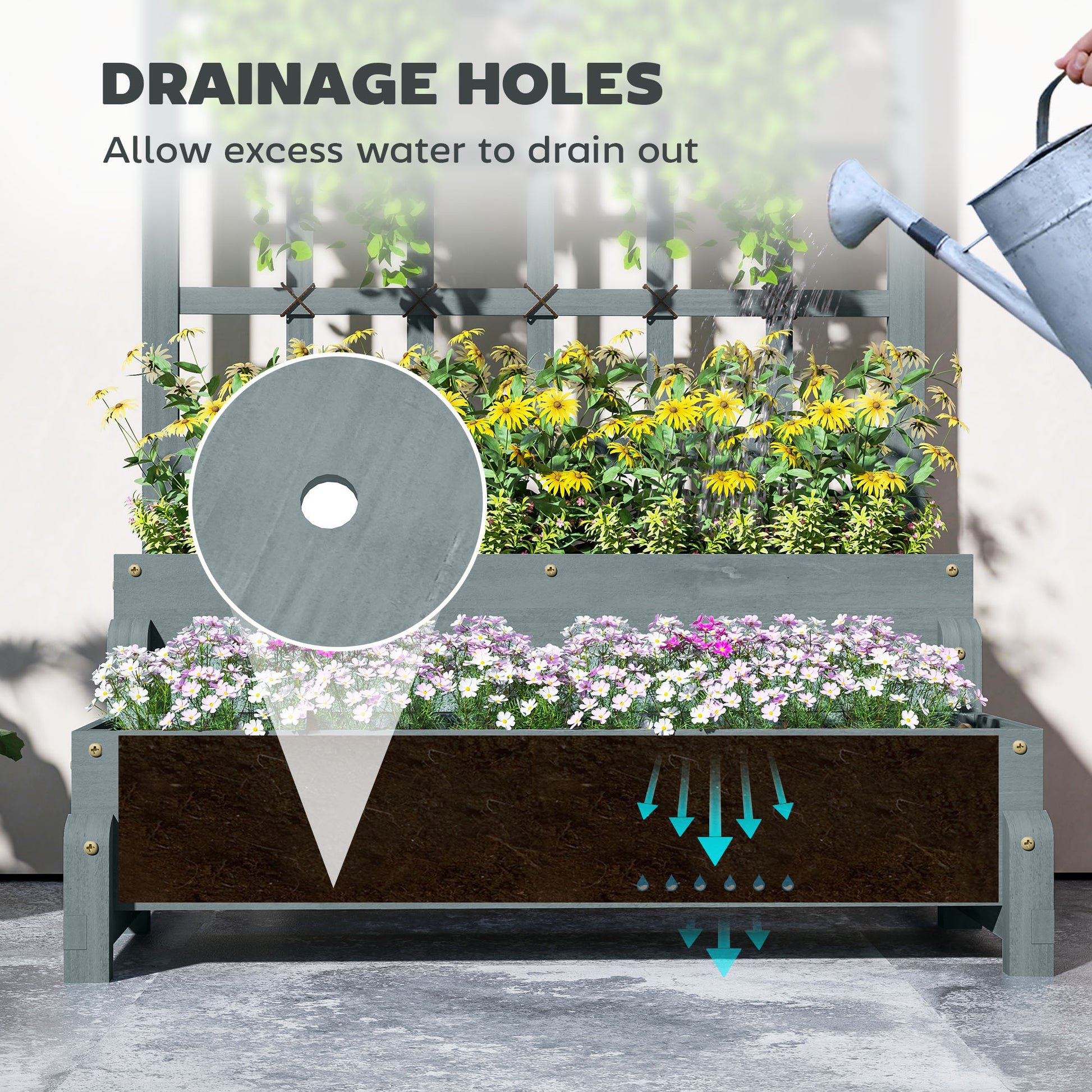 Discover the charm of the Outsunny wooden planter with its clever 2-in-1 design! This raised garden planter features a spacious planter box and a built-in trellis for your climbing plants. Enjoy easy gardening without the strain, thanks to its elevated structure, while the drainage holes and natural fir wood construction ensure your blooms thrive.