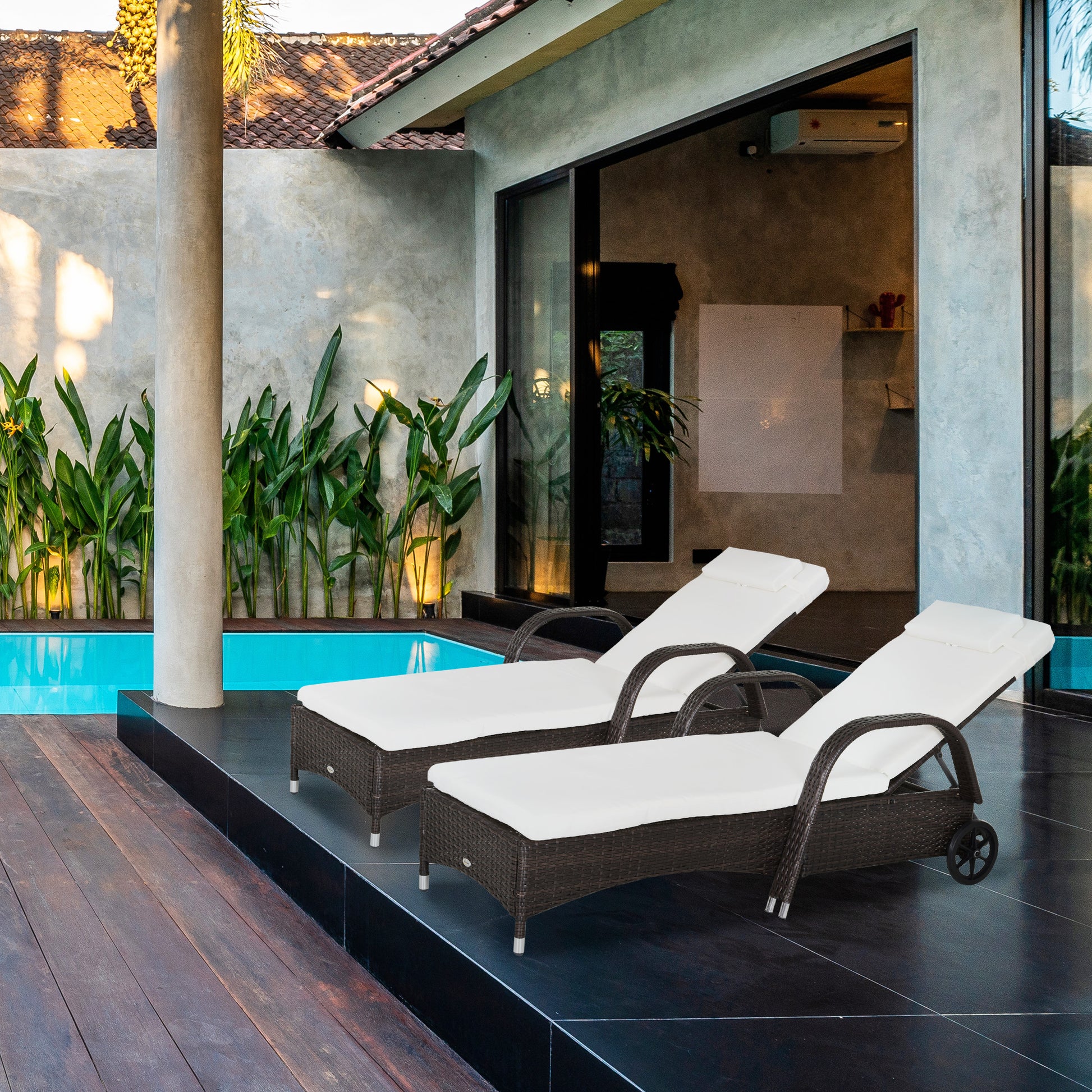 Outsunny 2PC Rattan Sun Lounger Recliner Bed Reclining Chair Patio Garden Outdoor Wicker Weave Adjustable Headrest with Fire Retardant Cushion – Brown