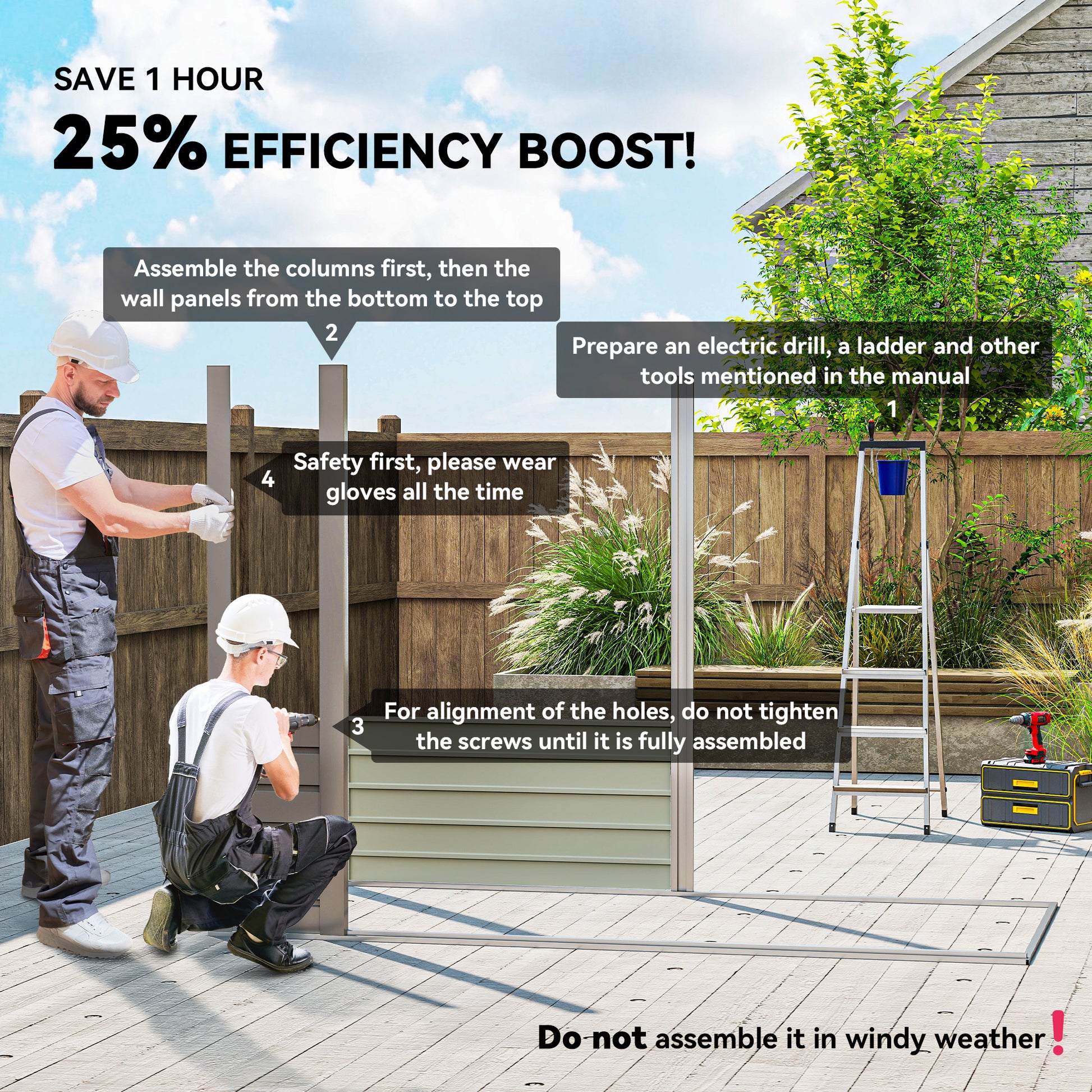 - 2-3 people required for build. Gloves included, must be worn at all times