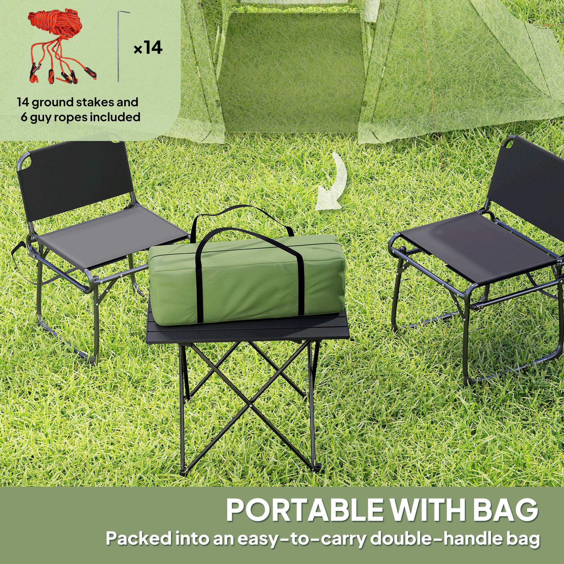 - Includes carrying bag, 6 guy ropes and 14 tent pegs