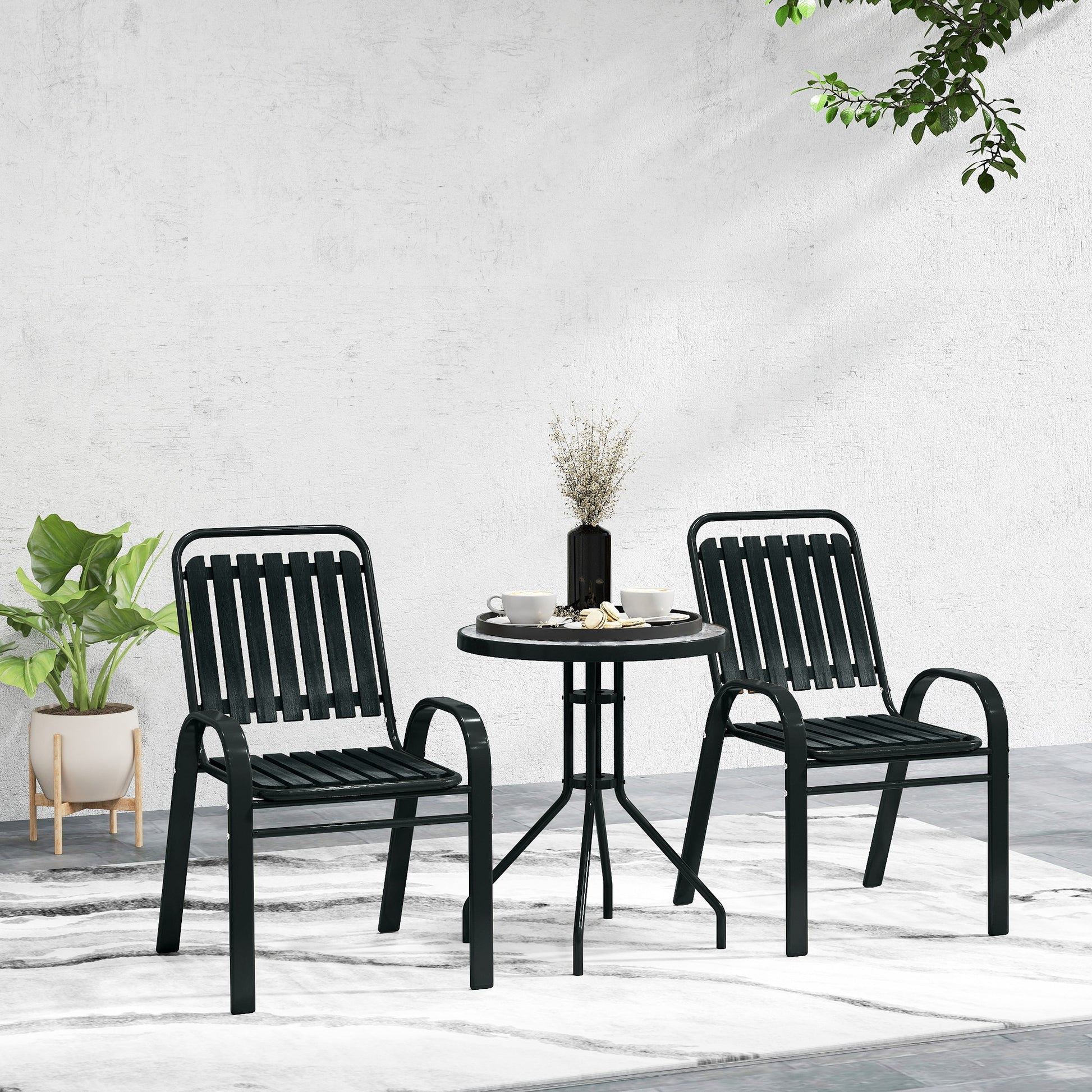 Discover the charm of the Outsunny Outdoor Bistro Set! This chic patio set features two armchairs with a stylish wood grain veneer and a sophisticated water-ripple tempered glass coffee table. Its stackable design makes it a space-saver for any garden, patio, or balcony, ensuring elegance and functionality in your outdoor space. Enjoy the blend of beauty and practicality, suitable for any conservatory or garden setting.