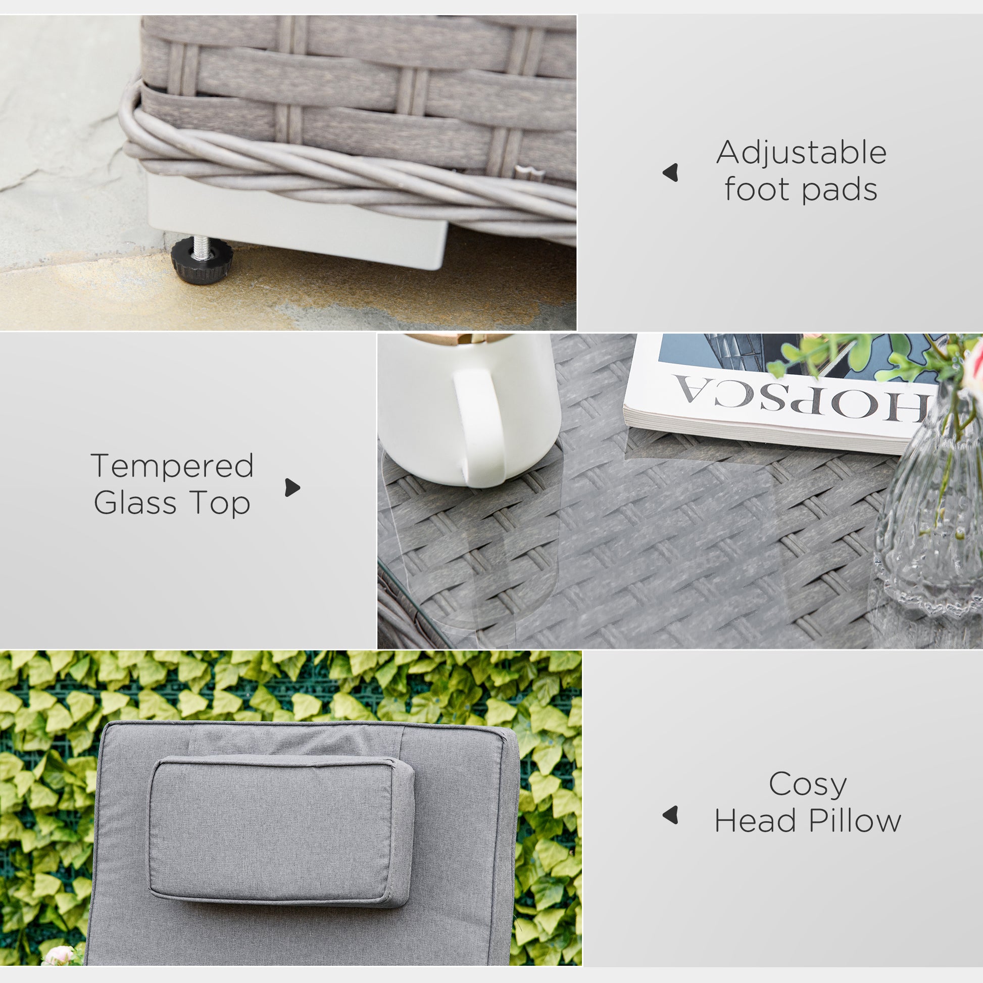 Outsunny 3 Pieces Rattan Sun Lounger Set with Aluminium Frame, 5-Position Adjustable Reclining Garden Chairs and Glass Top Table, Wicker Garden Furniture Daybed with Cushions for Patio, Grey