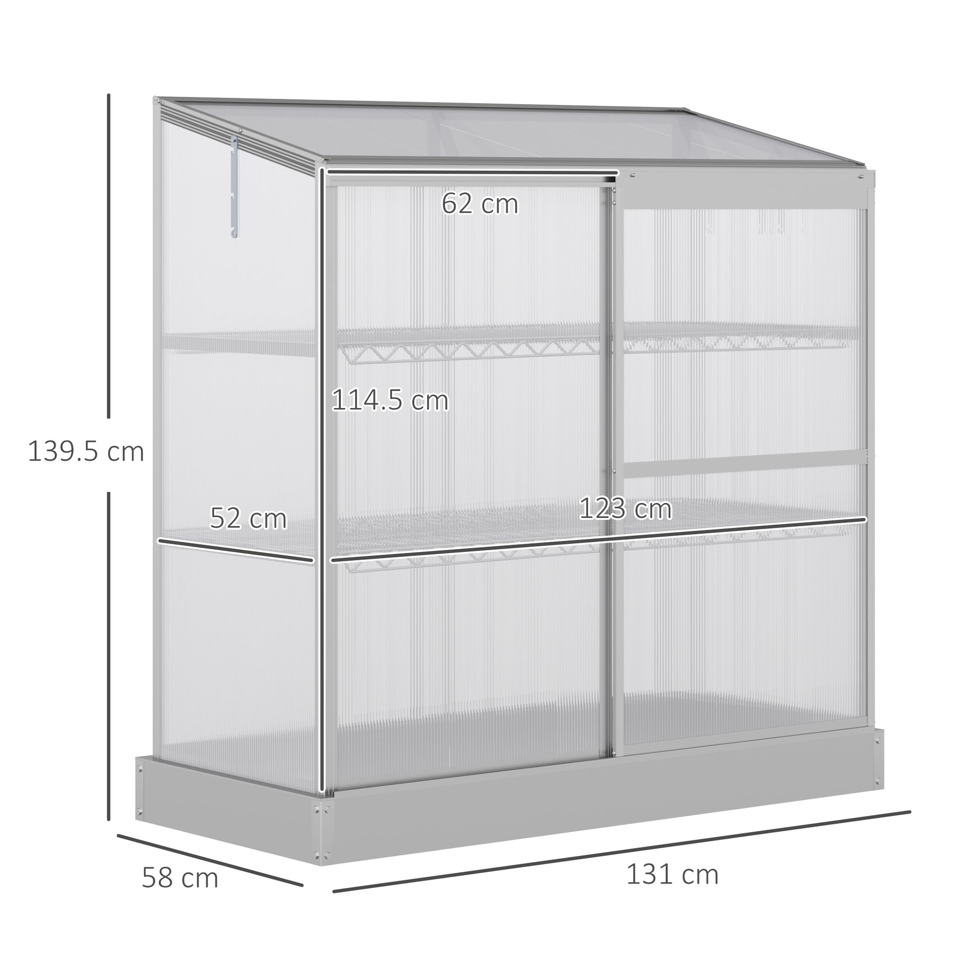 - Polycarbonate panels for protection, whilst allowing 90% light in for healthy growth