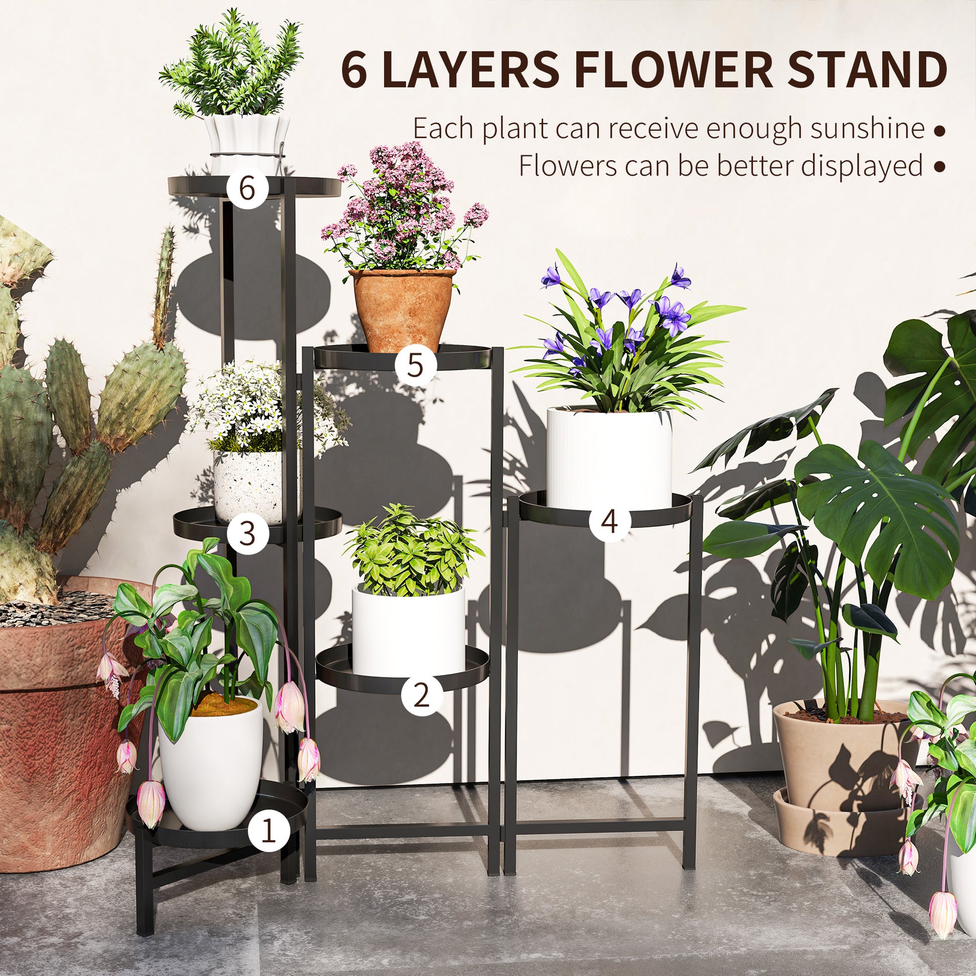 Discover the charm of the Outsunny Flower Stand, a versatile piece that marries strength with elegance. Whether as an indoor plant stand or an outdoor plant stand, this rust-proof, high-strength metal frame supports hefty weights and up to six pots. Its all-black, tiered design enhances any corner, folding neatly away when not in use for effortless elegance and functionality.