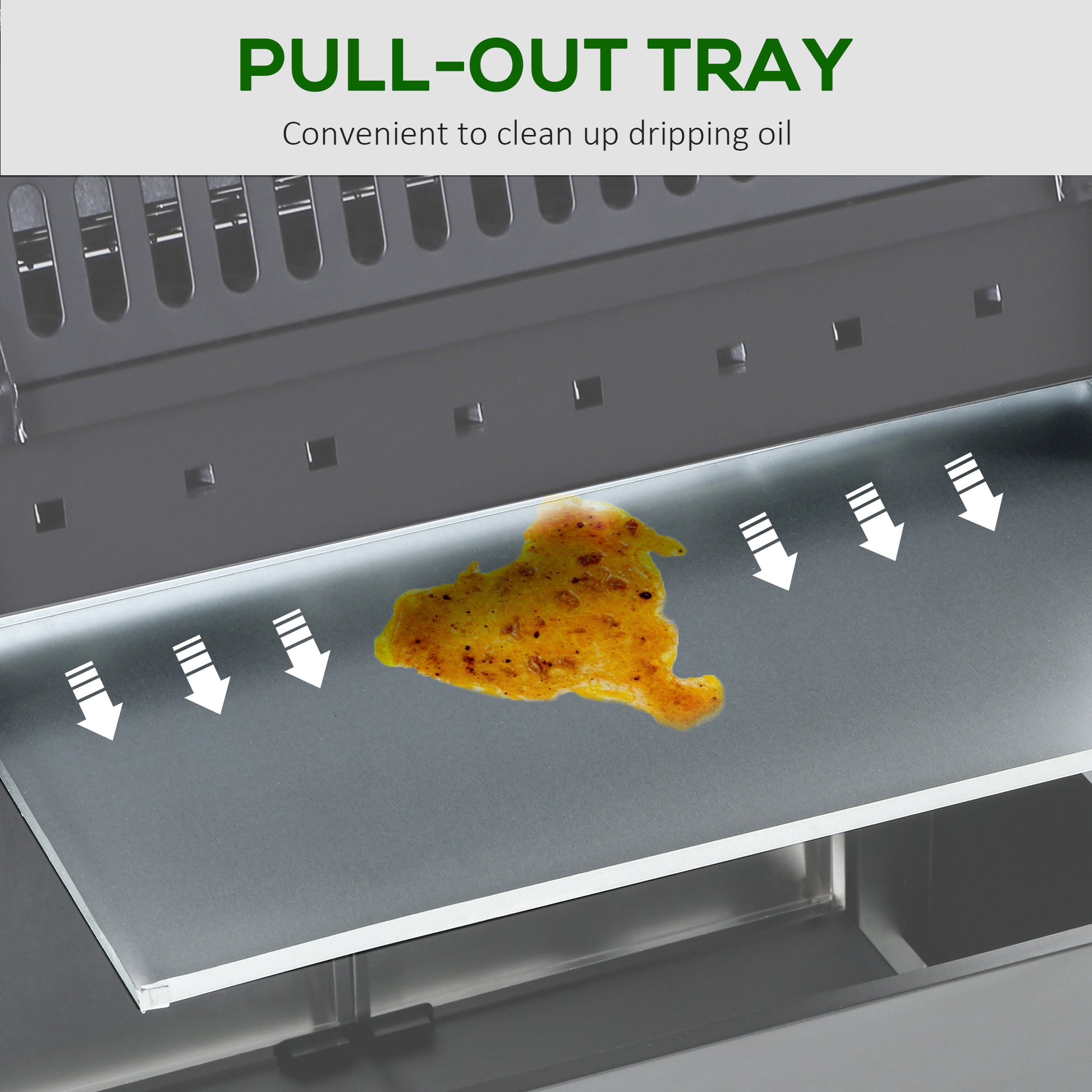 The 4 + 1 portable gas bbq for camping from Outsunny features 4 stainless steel burners and a stainless steel burner, great for outdoor barbecue parties. The lid design that helps preserve all the flavours. When preparing for your party, you can put all your grilling essentials and accessories within easy reach on the side tabletop or in the lower cupboard. Add the solid and safe BBQ and enjoy your cooking outdoors with complete peace of mind.