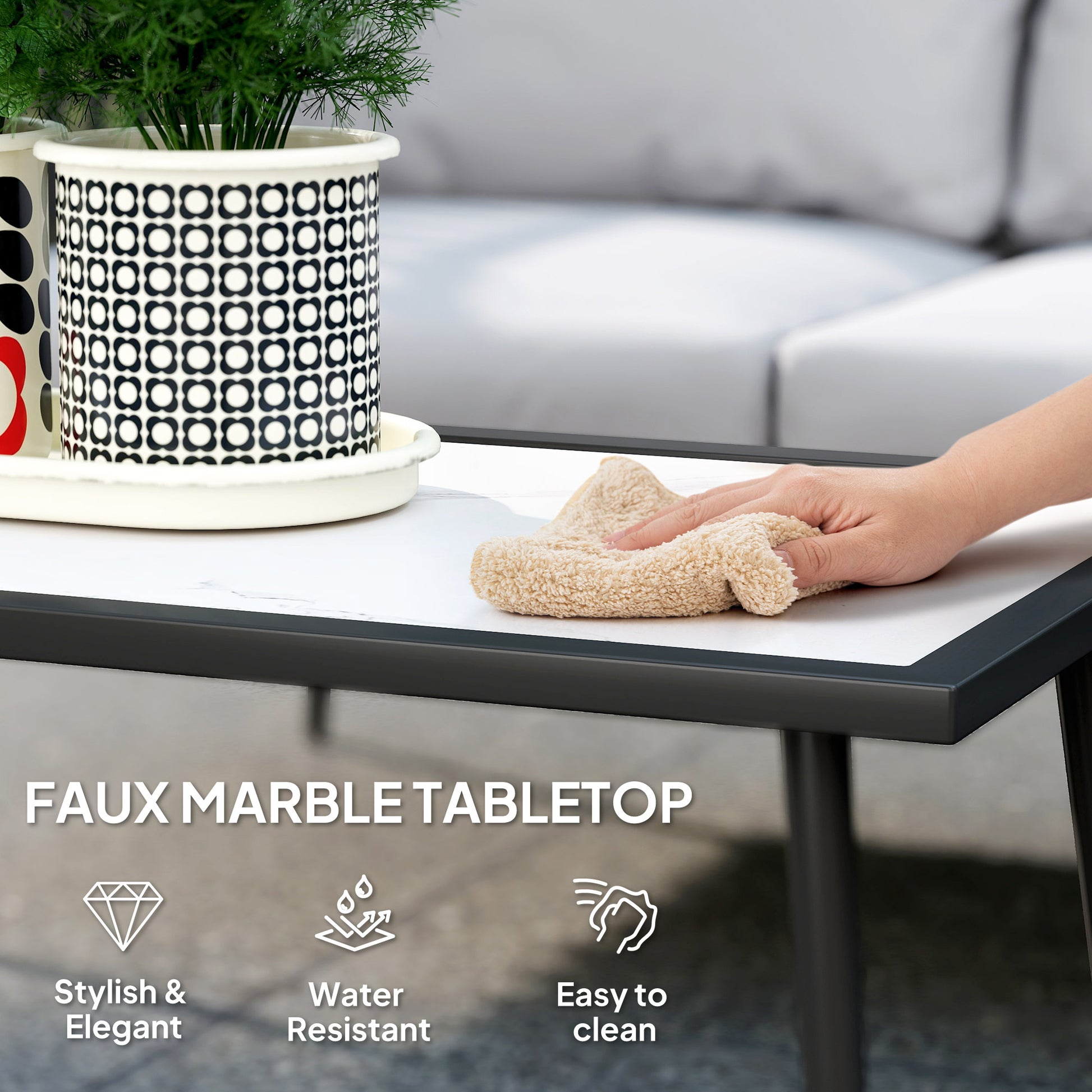 Transform your garden into a cosy haven with the Outsunny outdoor table and chairs. This four-piece ensemble, featuring a loveseat, two armchairs and a coffee table, brings comfort with removable and washable cushions. The faux marble tabletop adds a touch of elegance, making it a stylish addition to any patio furniture set. Enjoy the crafted woven design armrests that blend seamlessly with any outdoor decor.