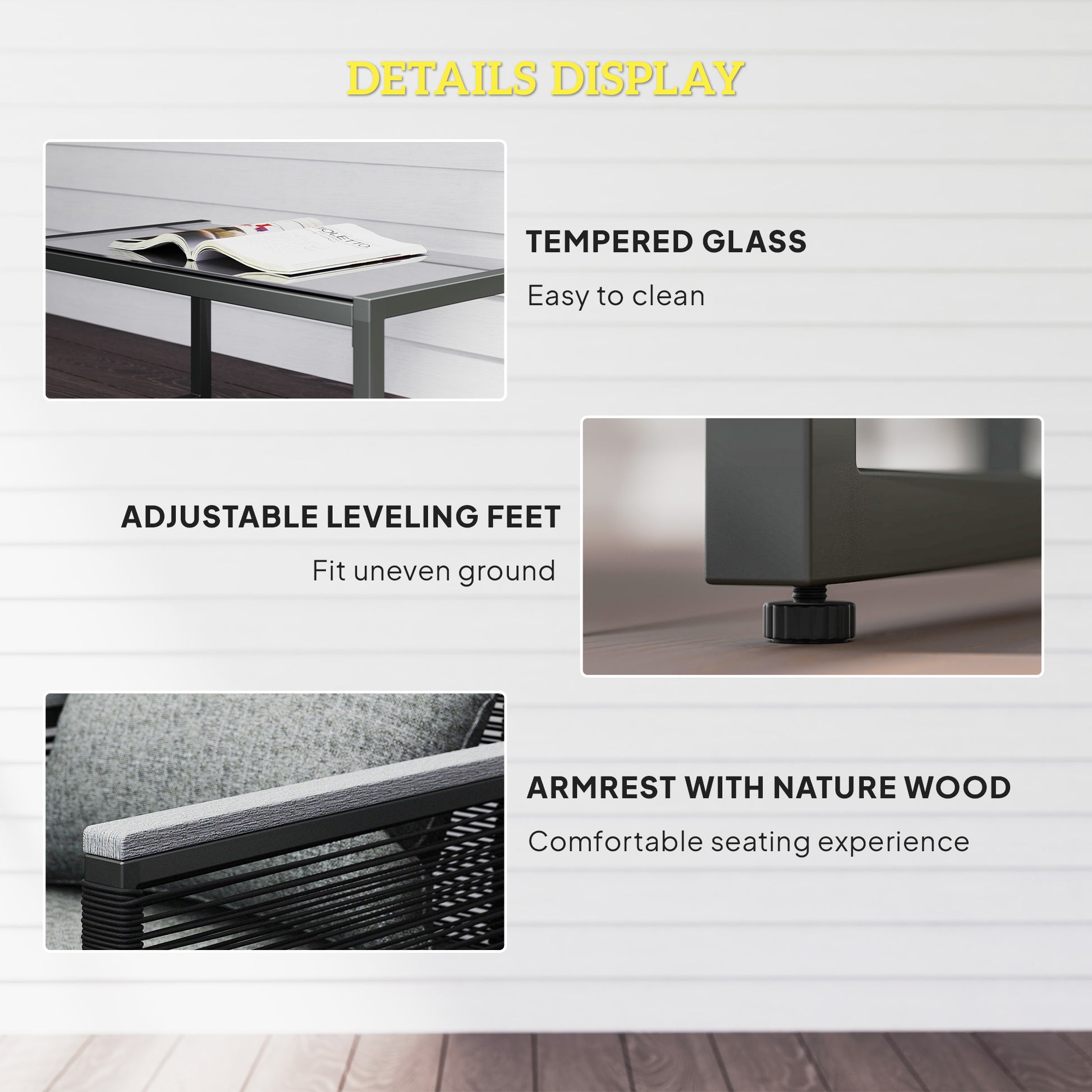 - Tempered glass on the coffee table is easy to clean
