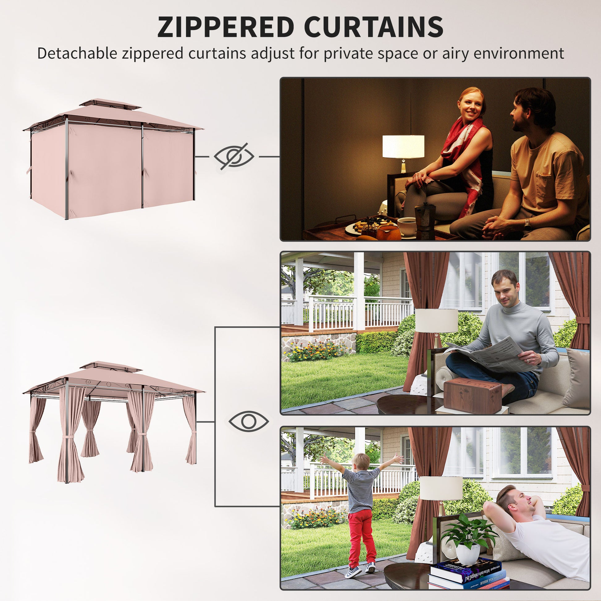 Outsunny 4m x 3(m)Garden Gazebo, Double Roof Outdoor Gazebo Canopy Shelter with Curtains, Solid Steel Frame for Patio, Garden, Brown