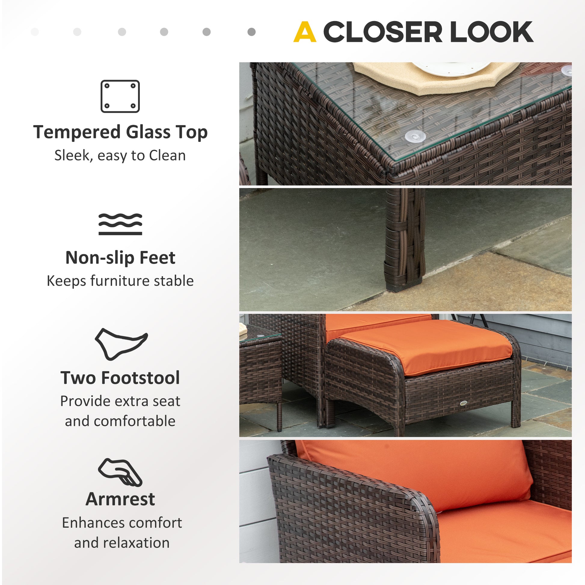 Outsunny 5 Pieces PE Rattan Garden Furniture Set with 10cm Thick Padded Cushions, Wicker Weave Outdoor Seating Chairs with 2 Armchairs, 2 Stools, Glass Top Table, Brown