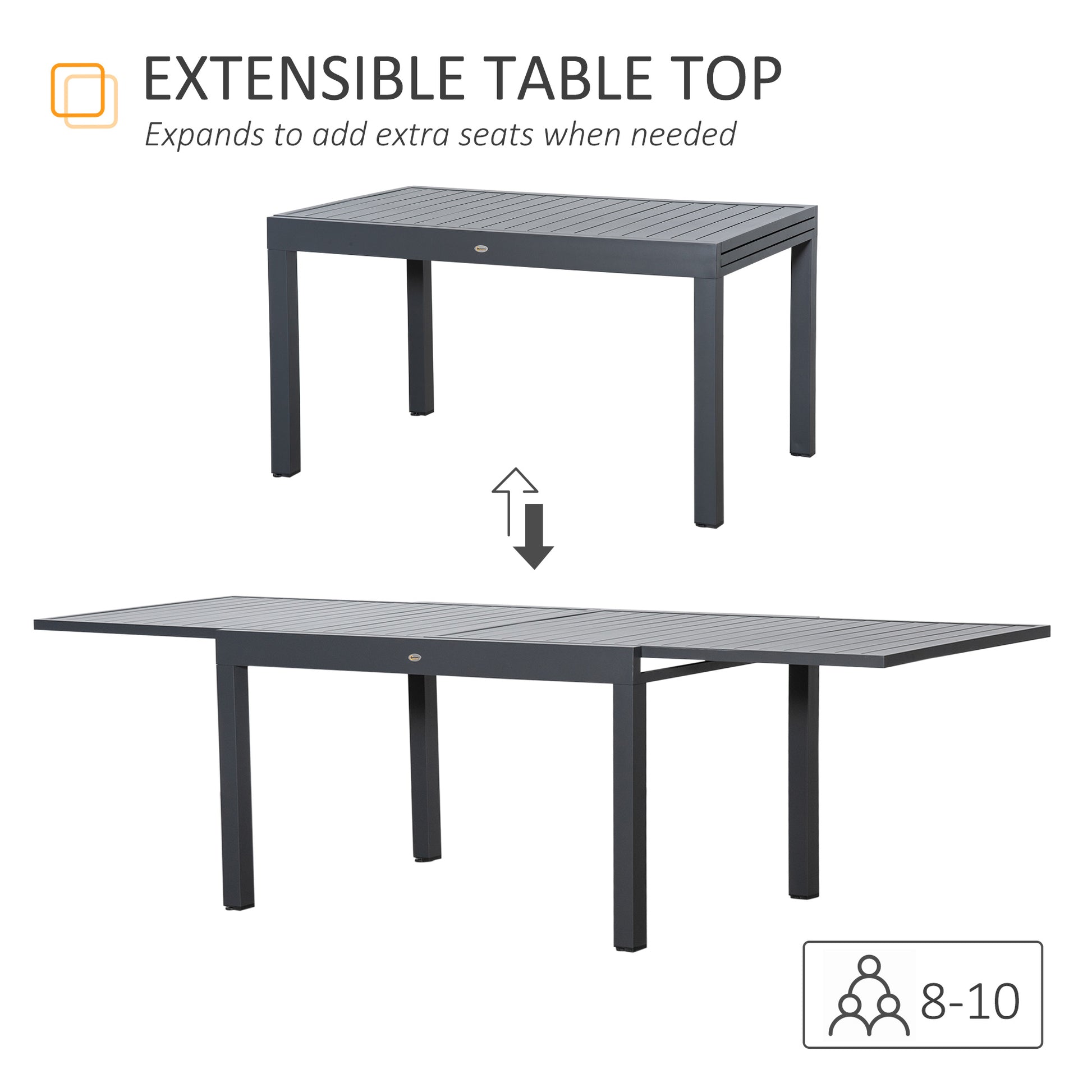 Pick a stylish addition for dining, afternoon tea and parties on patios, decks and more, with this extendable garden table from Outsunny. The powder coated aluminium frame is sturdy and durable. The tabletop extends between 135cm and 270cm - seating between eight and people: a large table great for when friends and family come over!