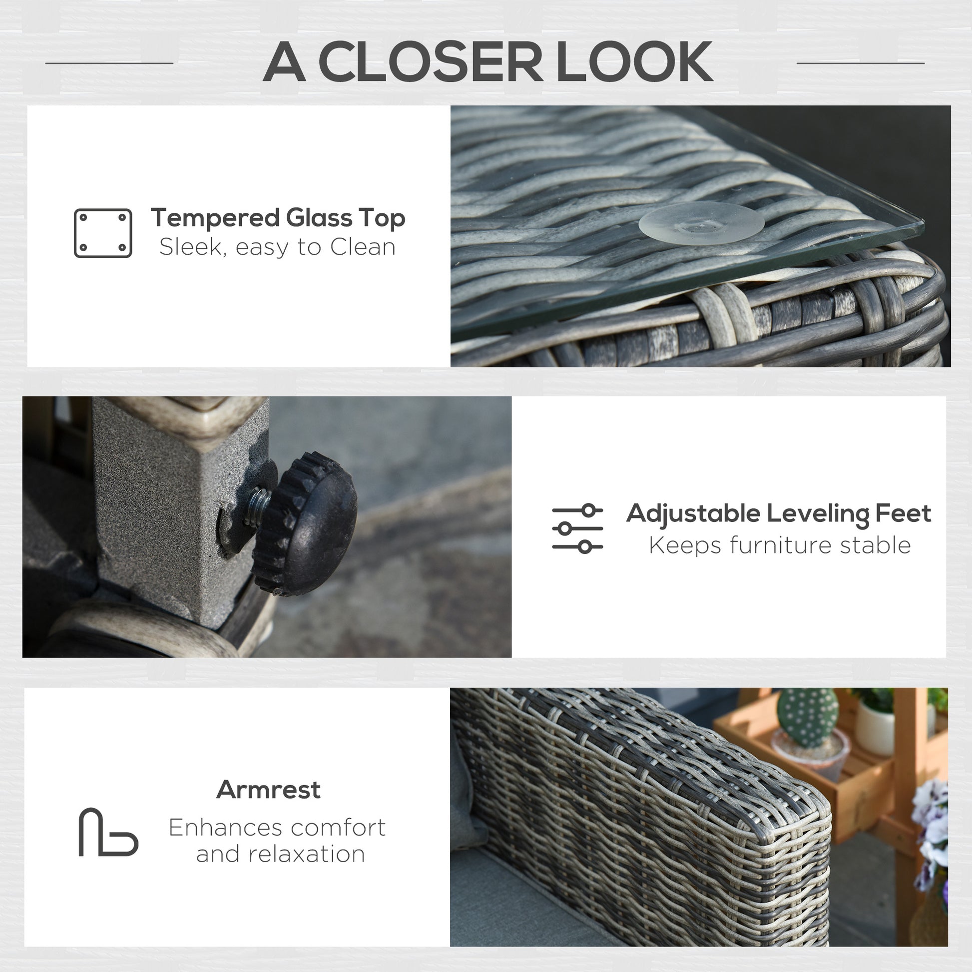 - Material: Aluminium, PE rattan, Vertical cotton, Polyester, Tempered glass