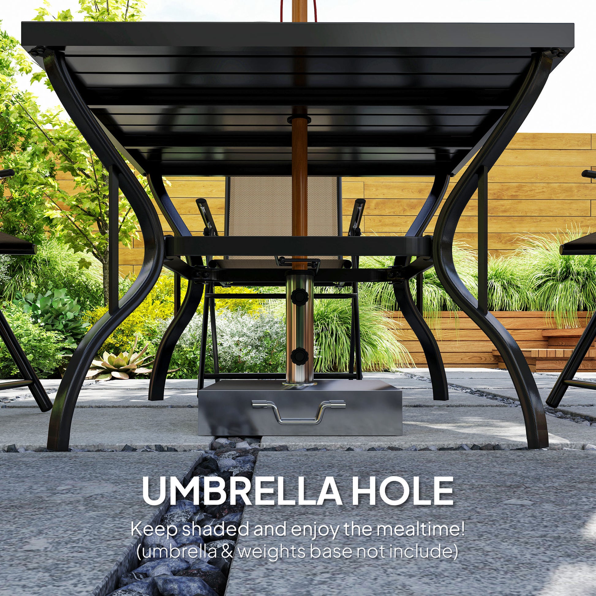 Simple, stylish outdoor dining with this Outsunny outdoor dining table and chairs set. It comes with a square dining table and four matching folding chairs: plenty of room for you and company. The powder coated galvanised steel frames mean the patio table and chairs are strong. The folding chairs save space and come with breathable texteline seats for comfort. This outdoor garden furniture set is complete with Φ50mm hole in the table to hold a parasol umbrella in place.