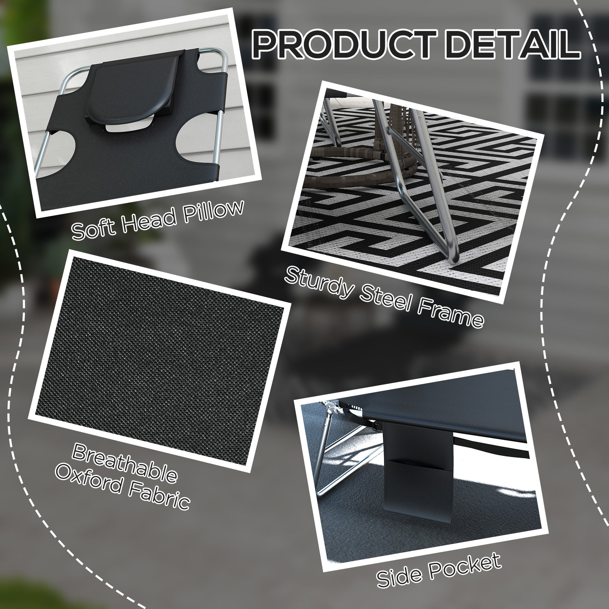A cool update on the foldable sun loungers from Outsunny. Features a padded head hole at the front to allows you to rest your face in comfortably, which is perfect for relaxing or even reading a book! The powder coated steel frame is strong and solid to support up to 120 kg. The reclining backrest is five positions adjustable, easy to set and lock to a position you like best. Complete with a handy side pocket.
