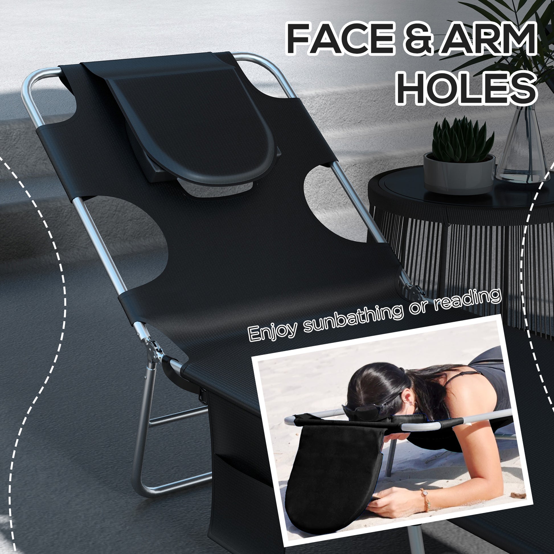 Outsunny Foldable Sun Lounger Set of 2, Beach Chaise Lounges with Reading Hole, Arm Slots, 5-Position Adjustable Backrest, Side Pocket, Pillow for Patio, Garden, Beach, Pool, Black