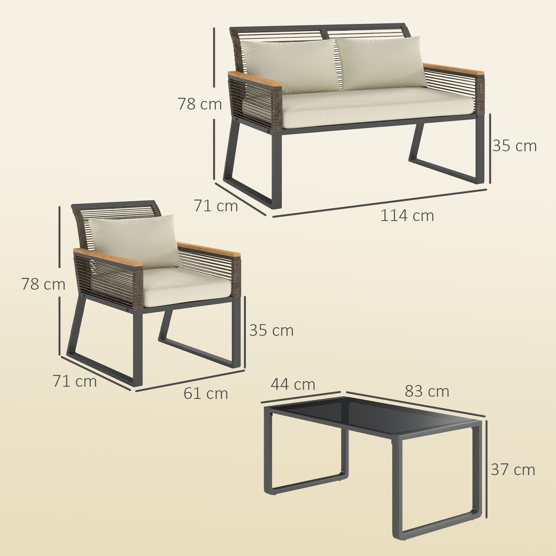 Brighten up your outdoor area with the Outsunny metal garden furniture set, decorated with round rattan ropes for boho chic. Including two armchairs, a loveseat and a coffee table, it's great for any gathering. Crafted with UV-resistant PE rattan and robust steel frames, equipped with soft cushions and complete with a sleek tempered glass table, this outdoor sofa set is a stylish staple for any garden, balcony, or conservatory.