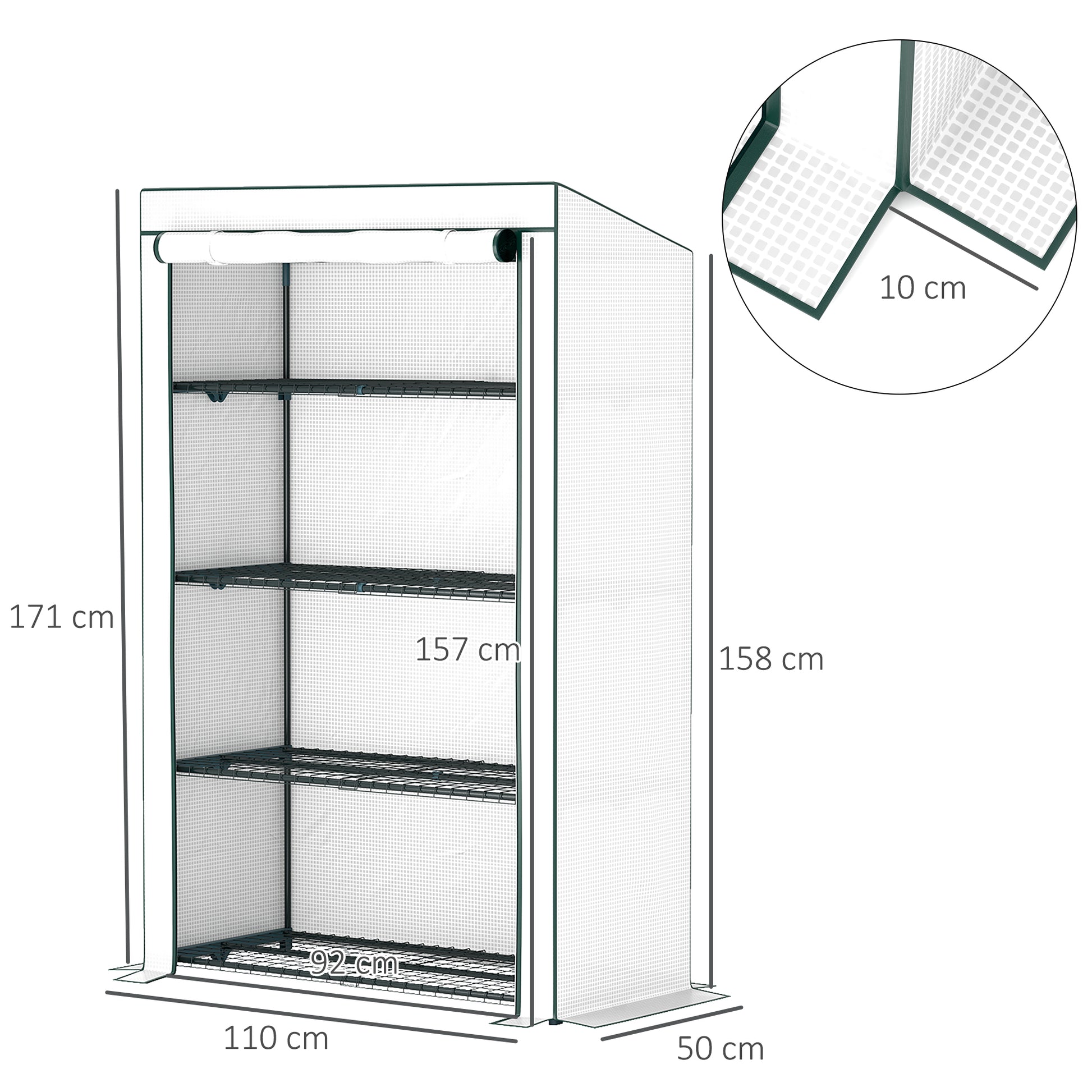 This Outsunny four-tier greenhouse offers lots of space for flower pots, seed trays and more; the inside is protected with the 140g/m² plastic cover - shields plants from outer weather, whilst allowing nourishing sunlight through. Complete with a roll-up zipped for easy access and fresh air, whenever you want.