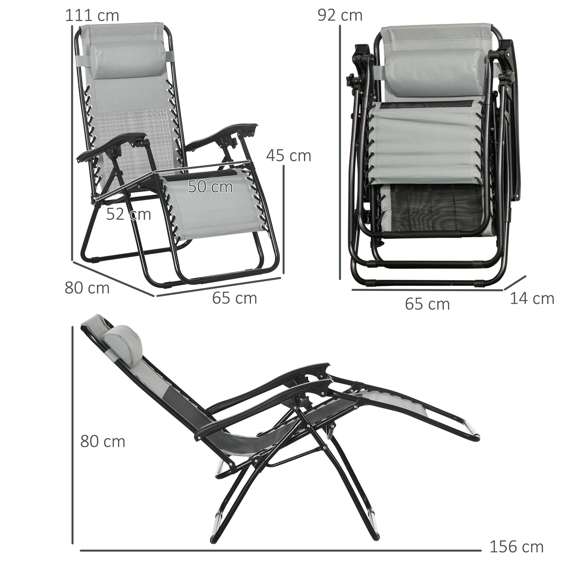 It's time to lounge and relax with Outsunny. This set of two zero gravity chairs are here to elevate the body in a comfortable position, for you to soak up the sun all afternoon long. A powder coated steel frame for a strong core, the frame can be folded so you can carry and store it easily. Comes with a fabric seat, with padded top pillow to rest your head. The back is freely adjustable to any angle you want - with a lock to fix the chosen position in safely.