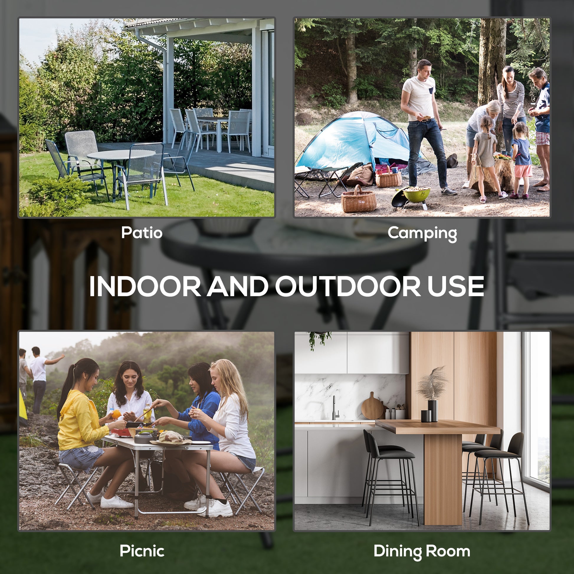 An essential for outdoor spaces. Pair this Outsunny patio side table with your chair: create a spot where you can sit, drink and enjoy the fresh air. A powder coated steel frame for a strong structure; it can be folded so it can be carried around and stored easily. Fitted with a round tabletop, the tempered glass is thick and ensures a safe dining/holding surface. A must for this season and beyond.