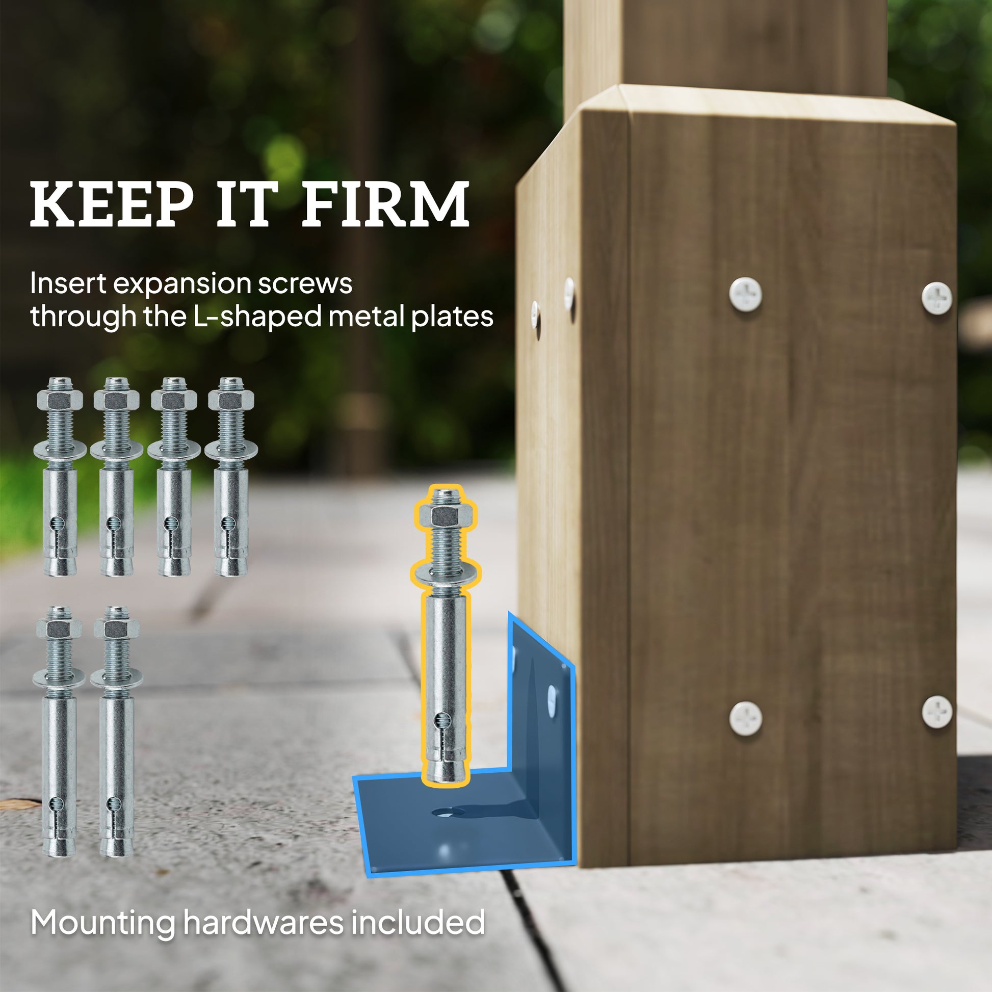 - Expansion screws and metal plates included to mount your pergola to hard ground